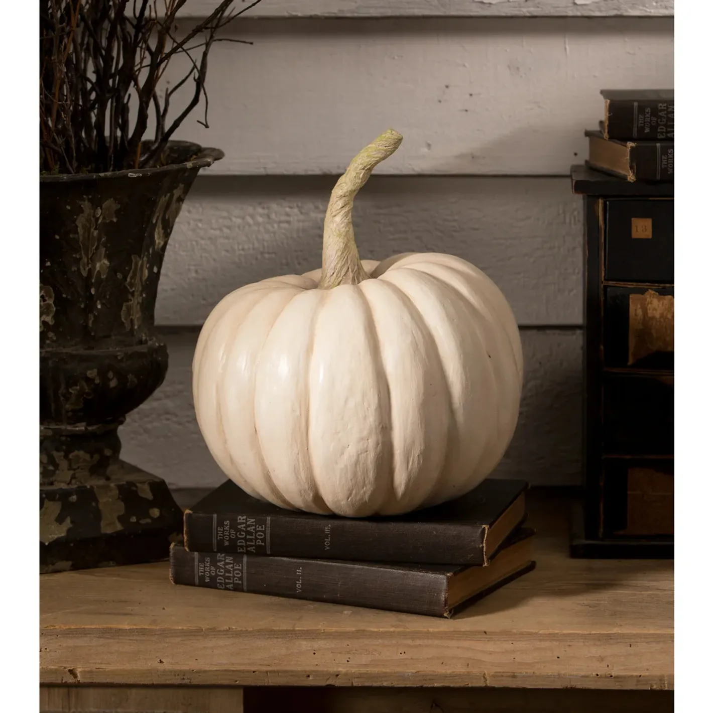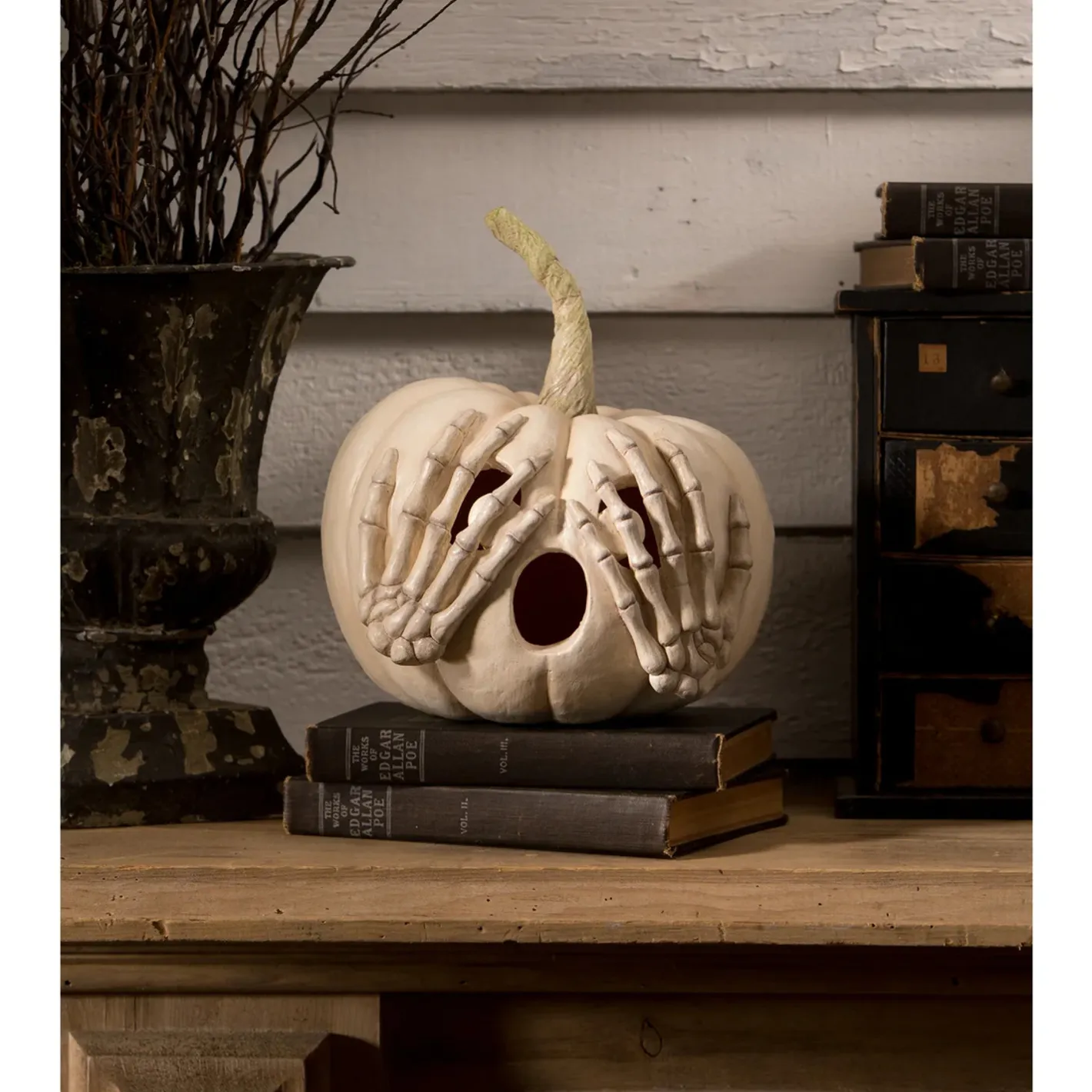 Peek a boo! I see you! Behind a pair of skeleton hands features a white pumpkin with scared face and a long stem on the top! Perfect to place on your mantle or use as a centerpiece! Sold with Single Light Cord or without. Made by Bethany Lowe. Made of Hand-painted paper pulp and paper. Dimensions: 7.75″ X 7.75″ X 10″. Item #: TD3138