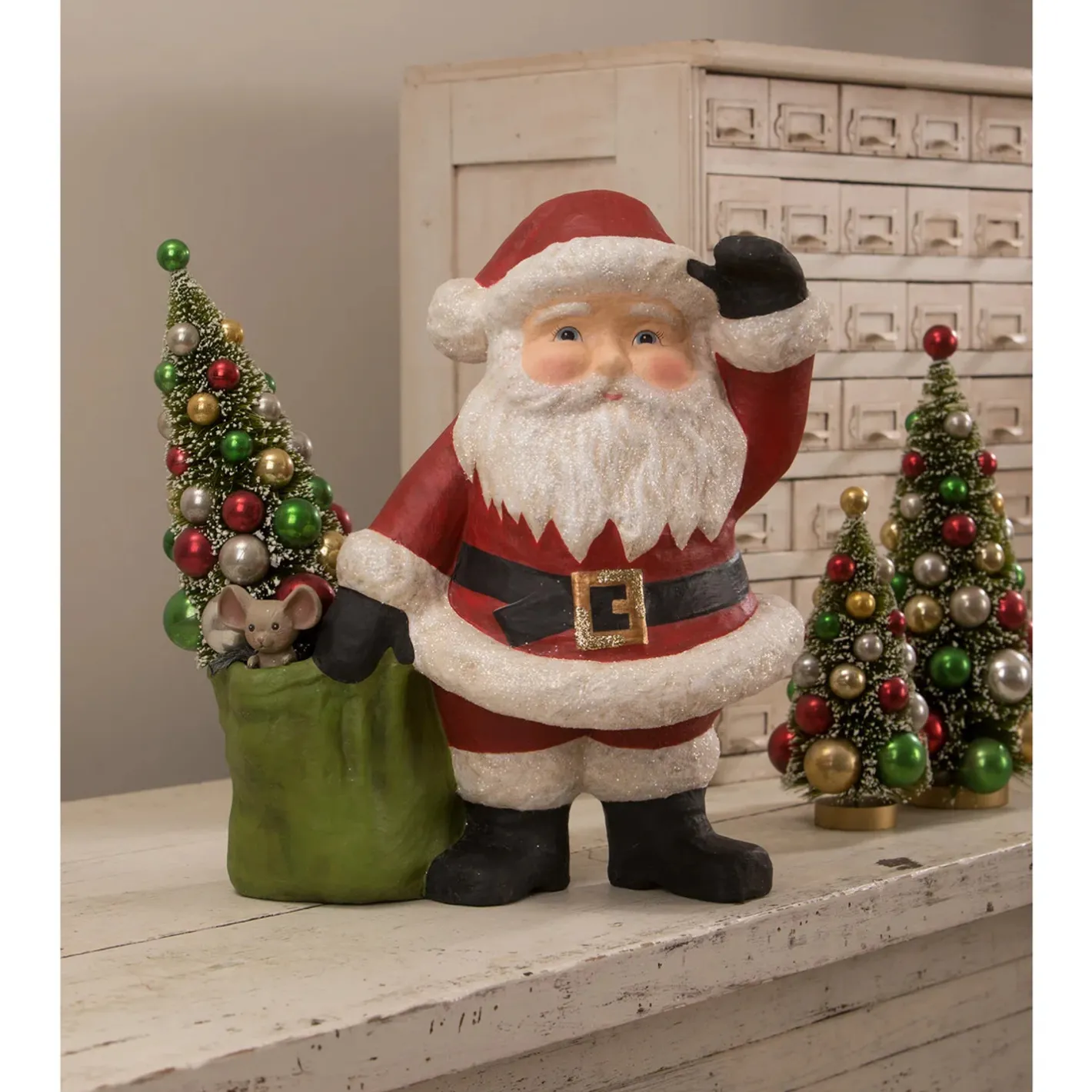 Bring home holiday cheer with the Bethany Lowe 17″ Jolly Waving Santa with Bag paper mache figure! Santa wears his classic red suit and gives a friendly wave with one hand, while dragging a green sack behind him—complete with an adorable little mouse peeking out! The bag is open and ready to be filled with a small tree, festive greenery, or sweet treats of your choice. A charming and customizable addition to your Christmas decor! Made by Bethany Lowe. Made of Paper mache and glitter. Dimensions: 13″ X 8″ X 17″. Item #: TJ1311