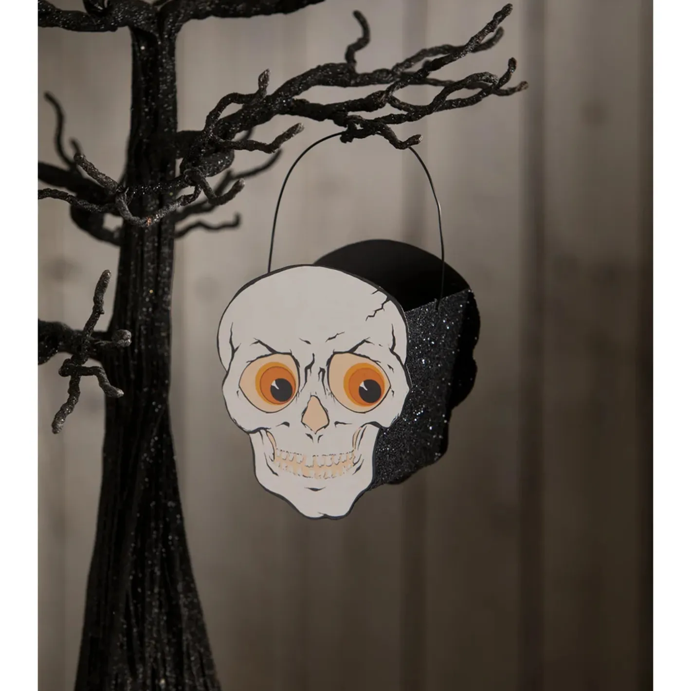 Use these tiny treat buckets to give out small gifts, fill with candy as party favors, or use as Halloween ornaments! Choose a bright orange jack o lantern with a green stem and bright eyes, a menacing skull with a wide smile and judging orange eyes, or a scaredy black cat with yellow eyes and a yellow mouth! Each sold individually. Made by Bethany Lowe. Made of  Tin, wire, glitter, and paper. Dimensions: Mr. Pumpkin: 3″ X 3.5″ X 3″. Mr. Skelly: 3.25″ X 3.25″ X 3.5″. Mr. Cool Cat: 3.25″ X 4.5″ X 3.5″.Â