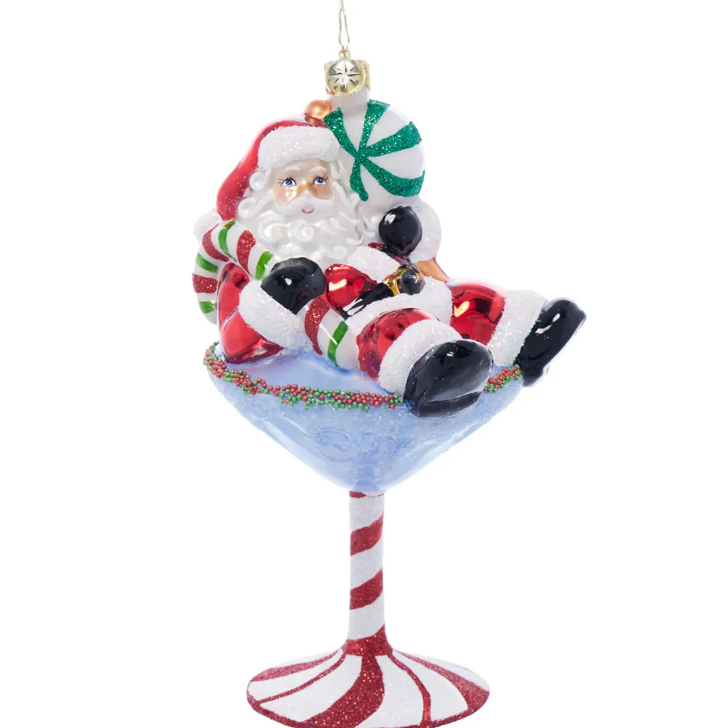 A toast to celebrate the holidays with the people you adore and love! This ornament features the jolly ol’ elf lounging in a clear martini glass with a peppermint stem! The rim is garnished with green and red sprinkles and Santa holds a candy cane and lollipop in his arms! Made by Christopher Radko. Made of glass. Dimensions: 6.25 in (H) x 3.75 in (L) x 3.12 in (W).