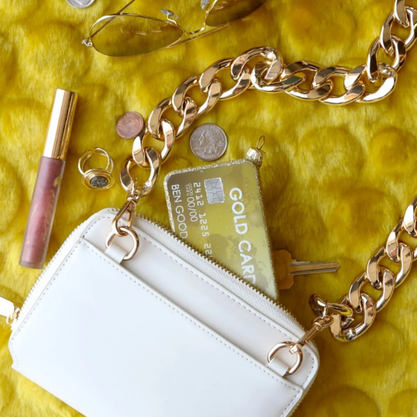 Time to flash that gold this holiday season! This ornament is perfect for those big spenders- it features a gold glitter credit card with the name “Ben Good” on the card! Made by Cody Foster. Made of glass. Dimensions: 3.75″L x .75″W x 2.5″H.
