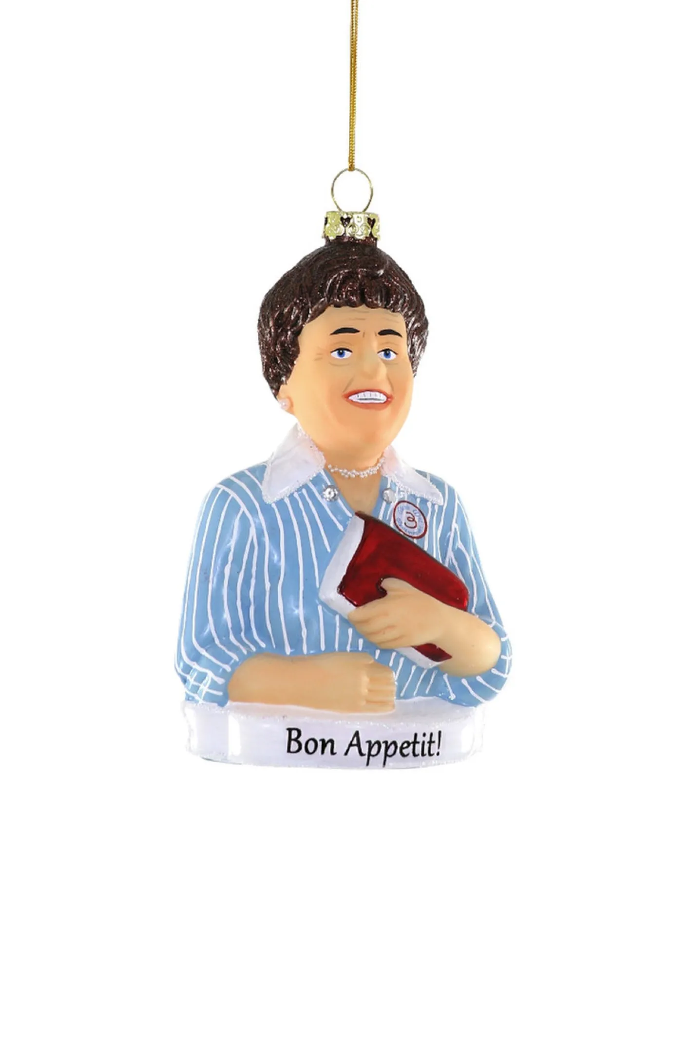 We all know and love Julia Child and seeing her cooking videos growing up! We’ve probably all tried one of her recipes at one point! This ornament features the TV personality in her signature blue and white striped shirt with long collar pleats holding a red cook book. Below her is a banner that reads “Bon Appetit!”. Made by Cody Foster. Made of glass. Dimensions: 3″L x 2″W x 5″H. Item #: GO-6651