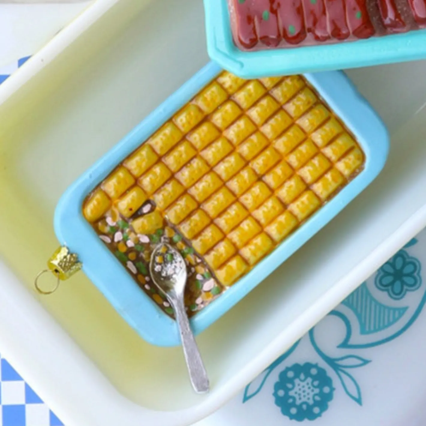 Everyone has their designated dishes to bring for the holidays! This ornament features a blue serving dish lined with golden brown tater tots! One corner is spooned out with a silver spoon where you can see speckles or onions, peas, and corn! Made by Cody Foster. Made of glass. Dimensions: 5″ x 1.25″ x 3.25″.