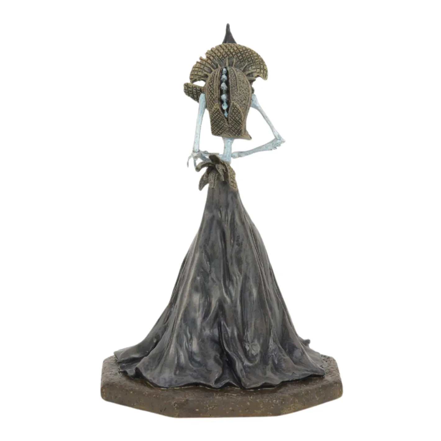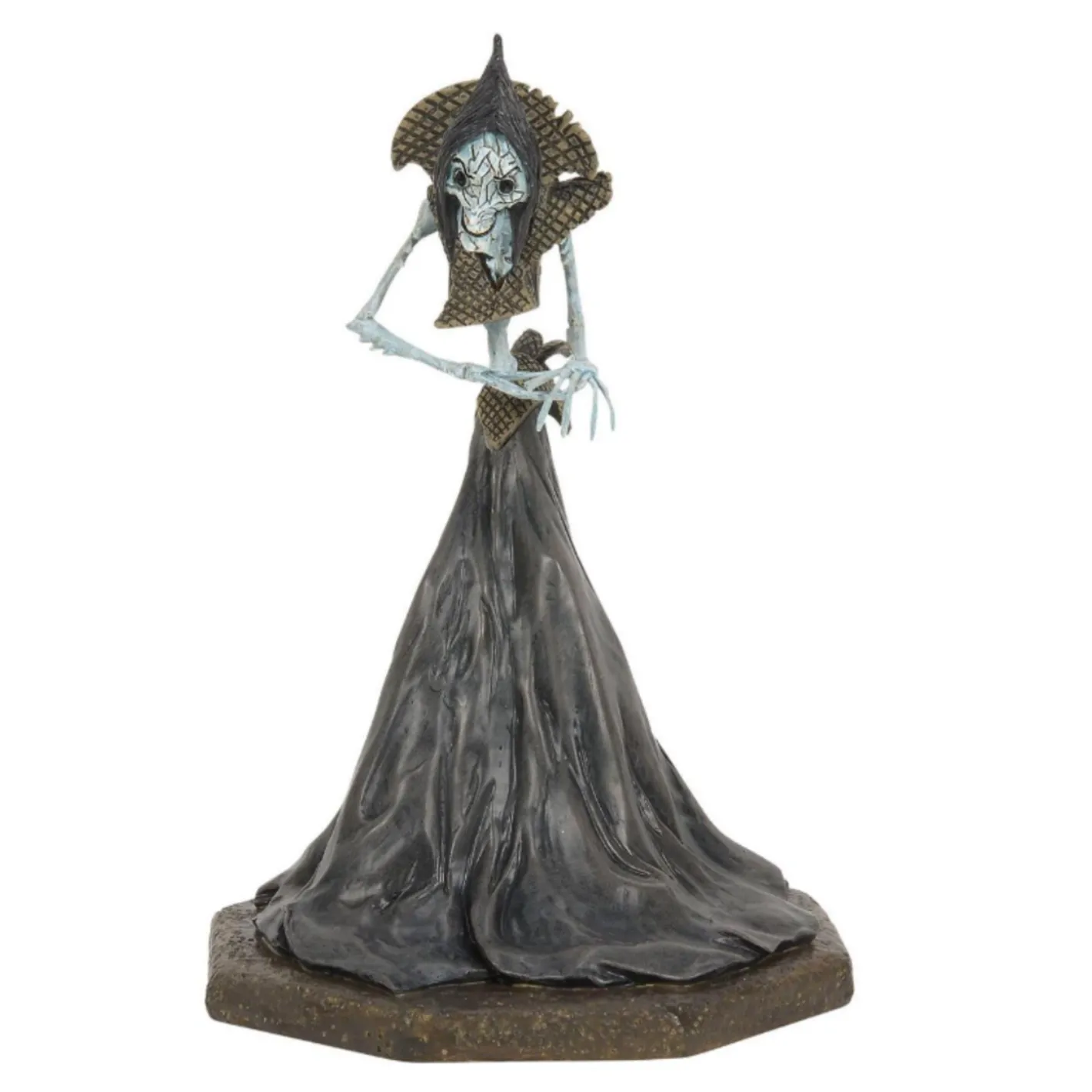 Step into the eerie world of Coraline with the spine-chilling Beldam Beckons figure. The Other Mother is a cunning predator, lurking in the shadows with her skeletal frame, spindly fingers like sewing needles, and piercing button eyes. Dressed in tattered clothing, she wears a sinister grin, ready to lure unsuspecting children into her web of deceit. Every detail of this figure captures the Beldam’s haunting presence, making it a must-have addition for any Coraline Village collector! Pairs with Coraline House and Figure 6015607 (sold separately). Introduced January 2025. Made by Department 56. Made of Plastic, Zinc alloy, Polyresin, Stone Powder. Dimensions: 6.69in H x 4.53in W x 4.41in L. Item #: 6015609