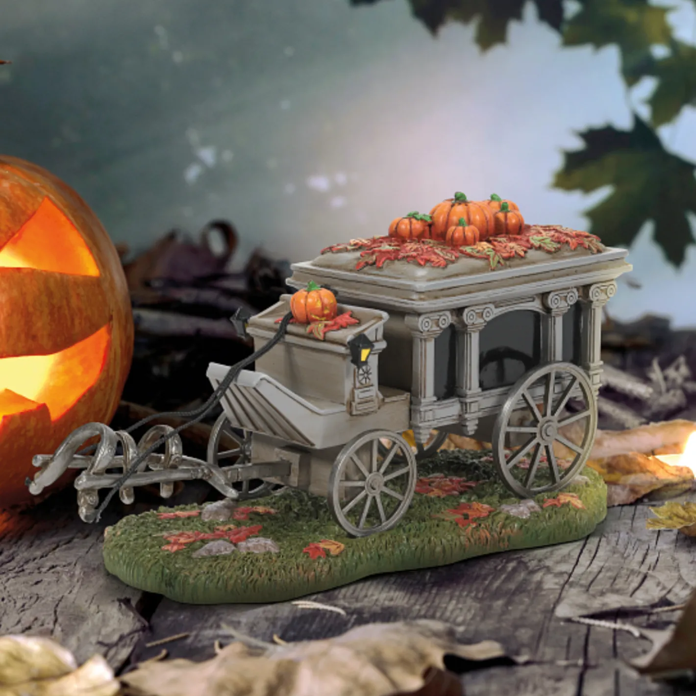 We all know and love Disneyland’s Haunted Mansion and the amazing detail that comes with it! This village piece features and antique hearse hitched up to a ghost horse just like the one that was added to the landscape outside of the ride in 1990! It is topped with orange pumpkins and colorful fallen leaves! Introduced October 2022. Made by Department 56. Made of polyresin and stone powder. Dimensions: 4.17in H x 3.62in W x 8.1in L. Item #: 6009775