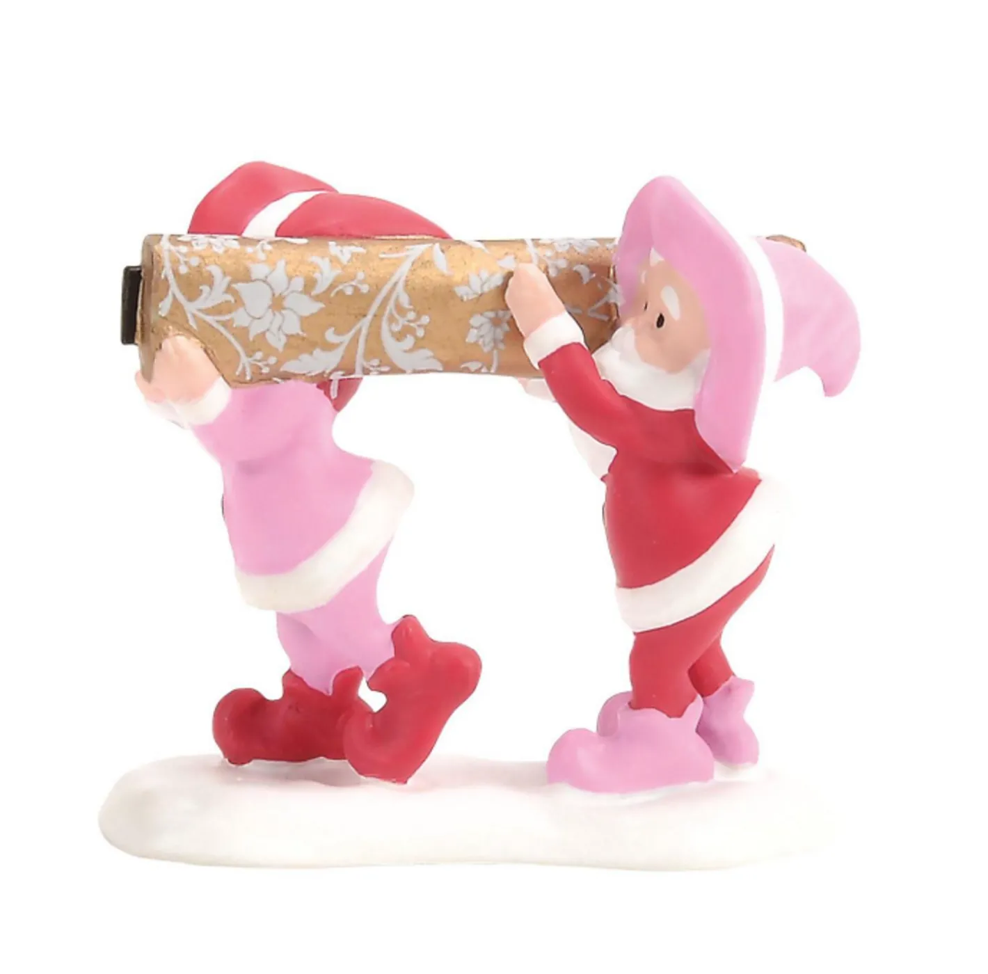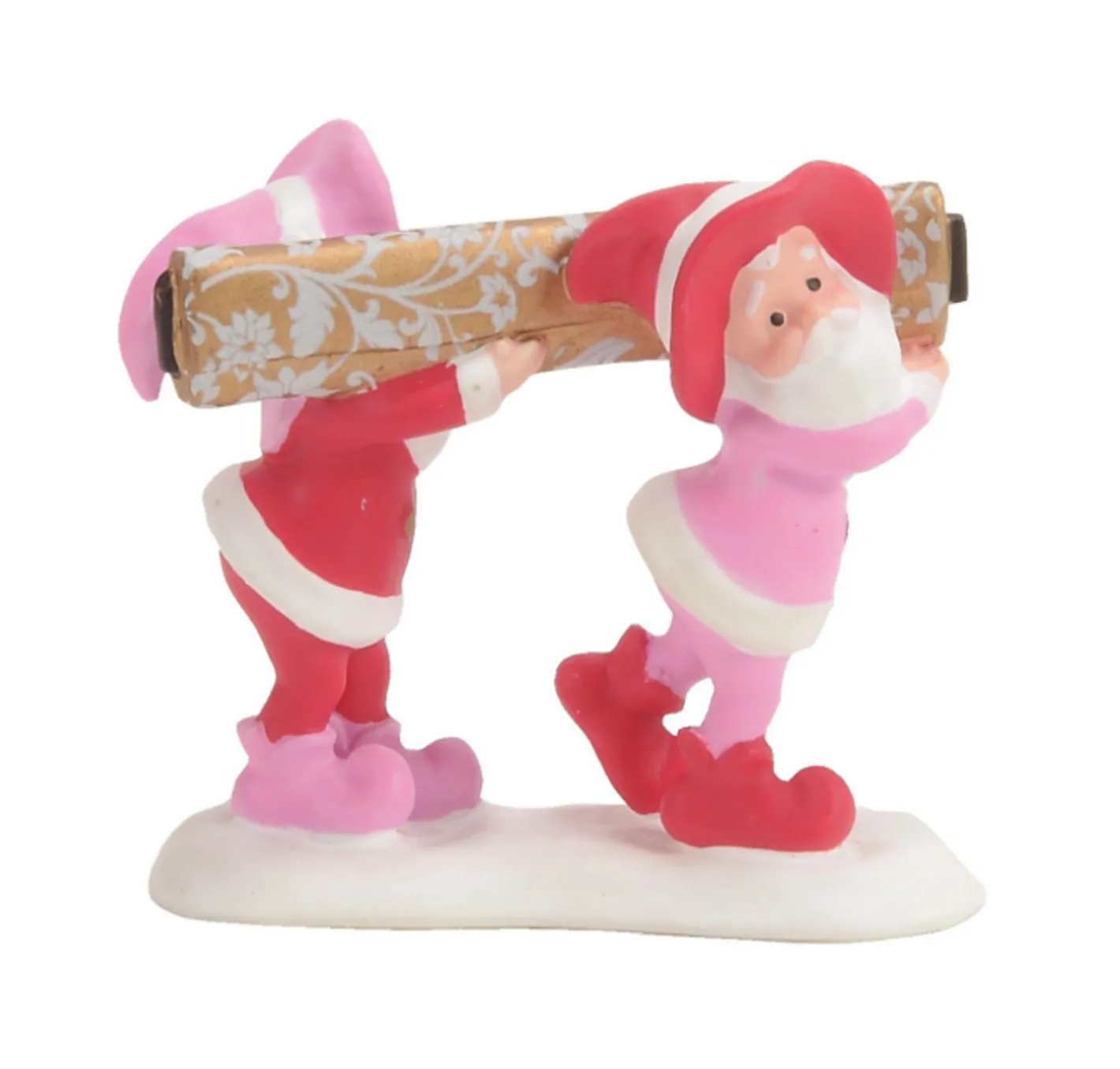 This gorgeous pink bricked building has shimmering gold metallic accents and piles of fresh fallen snow with large ink framed windows! Inside the largest window you can see the NEW 2025 holiday Barbie dressed in a breathtaking silver and gold damask dress and a snow white collar! A small elf dusts of he freshly debuted dress at her feet and a figure of a pair of elves bringing in the golden damask material to go outside of the building. This addition to the North Pole village is sure to make anyone’s Barbie dreams come true! Introduced January 2025. Made by Department 56. Made of porcelain. Dimensions: 6.4in H x 4.3in W x 5.9in L. Item #: 6014682