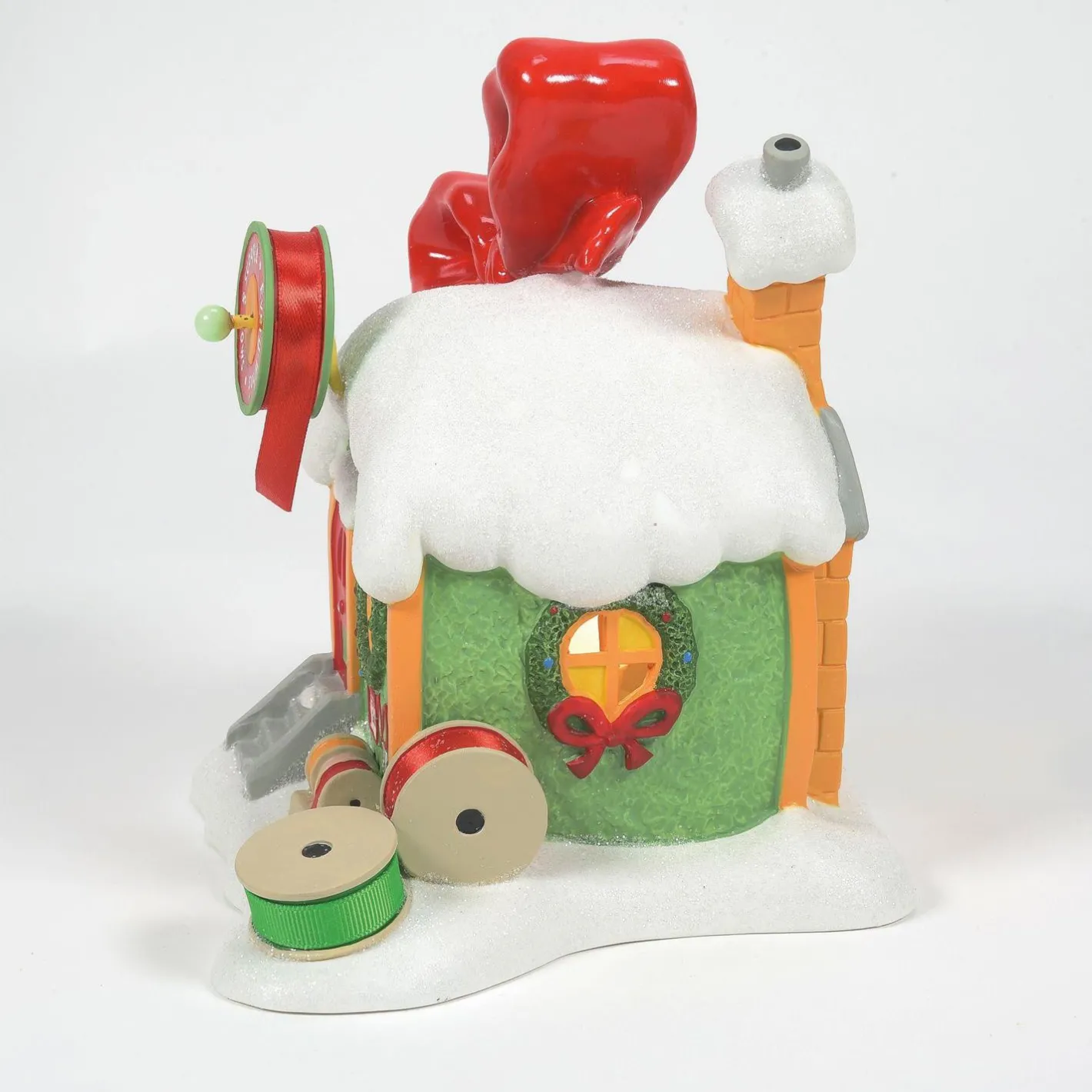 Ribbon Sale!! Stock up on the best ribbon on the block at Every Who’s! This building is a green stucco with yellow gold trim, a chimney poking out of the top, and a large spool of red ribbon with a giant bow behind just like the one Cindy Lou Who sports! Introduced January 2023. Made by Department 56. Made of resin. Dimensions: 6.93in H x 5.79in W x 7.24in L. Item #: 6009728 We are an authorized dealer for Department 56 products.