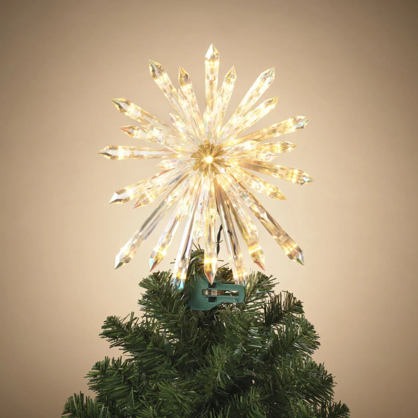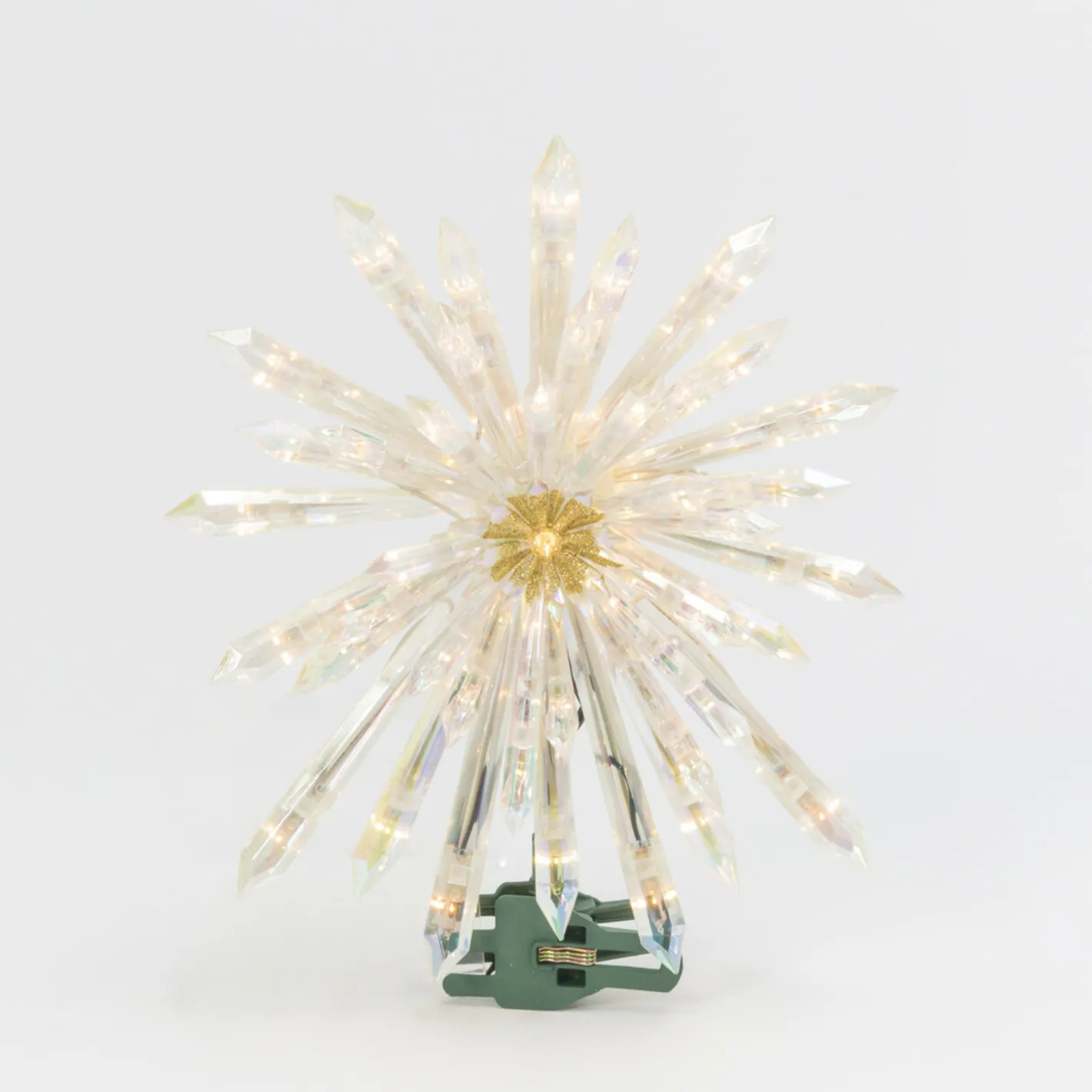 This gorgeous Christmas tree topper features an array of different sized crystals jutting out to create a star shape, in the center is a bright gold glitter! Made of plastic, NOT real crystal. Dimensions: 13.5″ x 4″ x 15″. Item #: 2619000