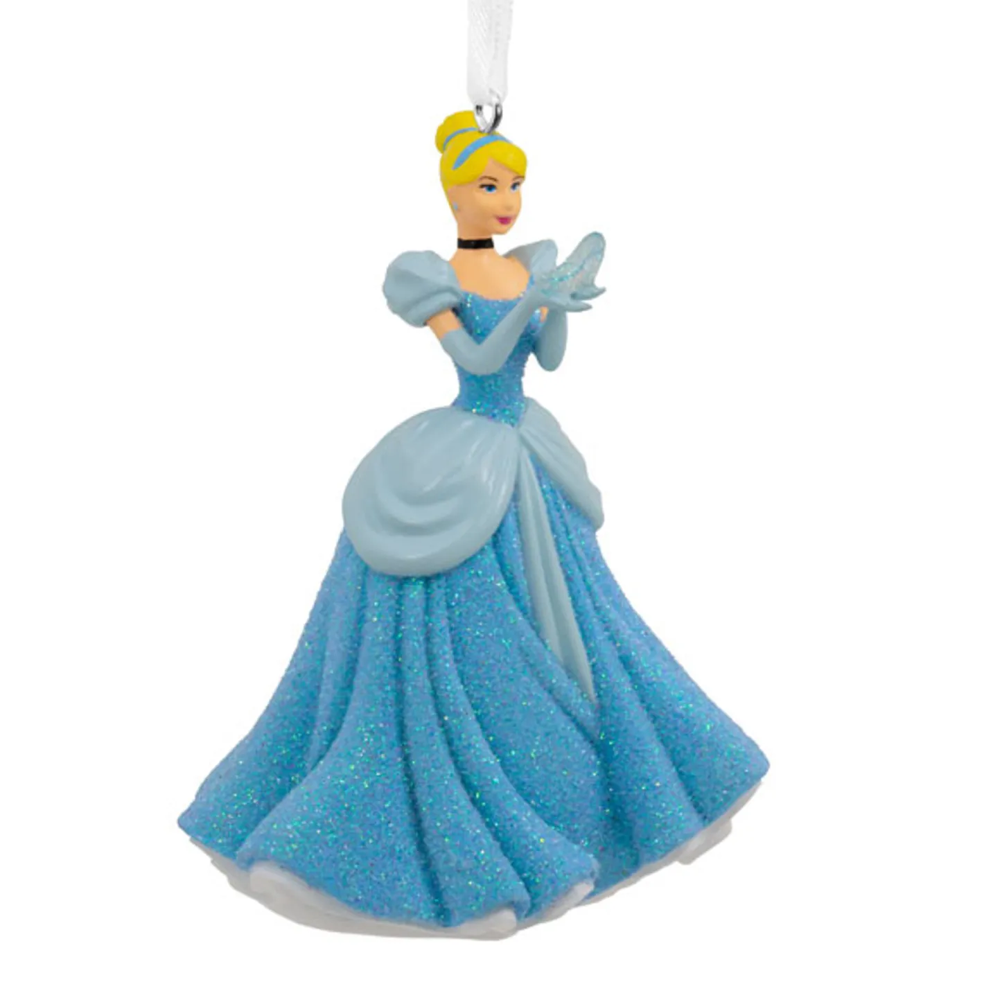 Cinderella has her golden blonde hair twisted up into a cute bun and decorated with a blue headband. Around her neck sits a small black choker necklace and she holds a sparkling glass slipper in her hand! Her iconic blue ball gown is decorated with glitter as it swirls around her! Made by Hallmark. Made of resin. Dimensions: 2.63″ x 3.5″ x 2.13″.