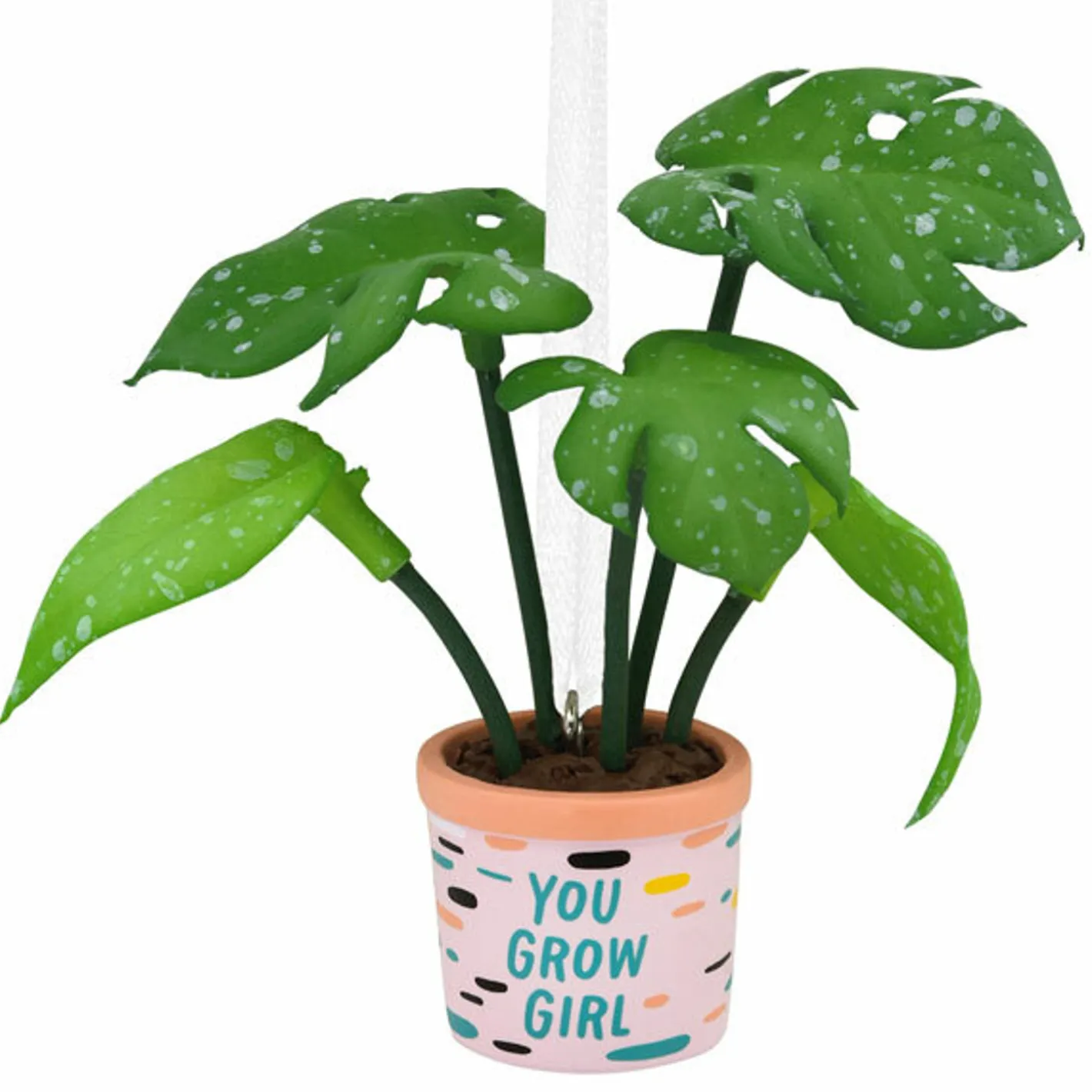 Plant ladies and dudes UNITE! This ornament features a colorful pot that reads “You Grow Girl!” on the front with a large variegated monstera snuggled planted in the pot! Perfect for any plant lover on your Christmas list! Made by Hallmark. Made of resin and polyester. Dimensions: 1.8″ x 3″ x 3″. Item #: 1HGO2809