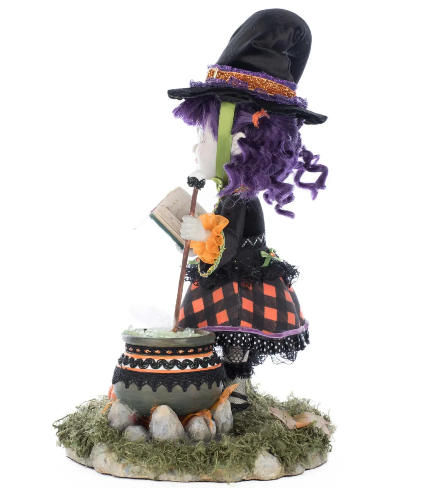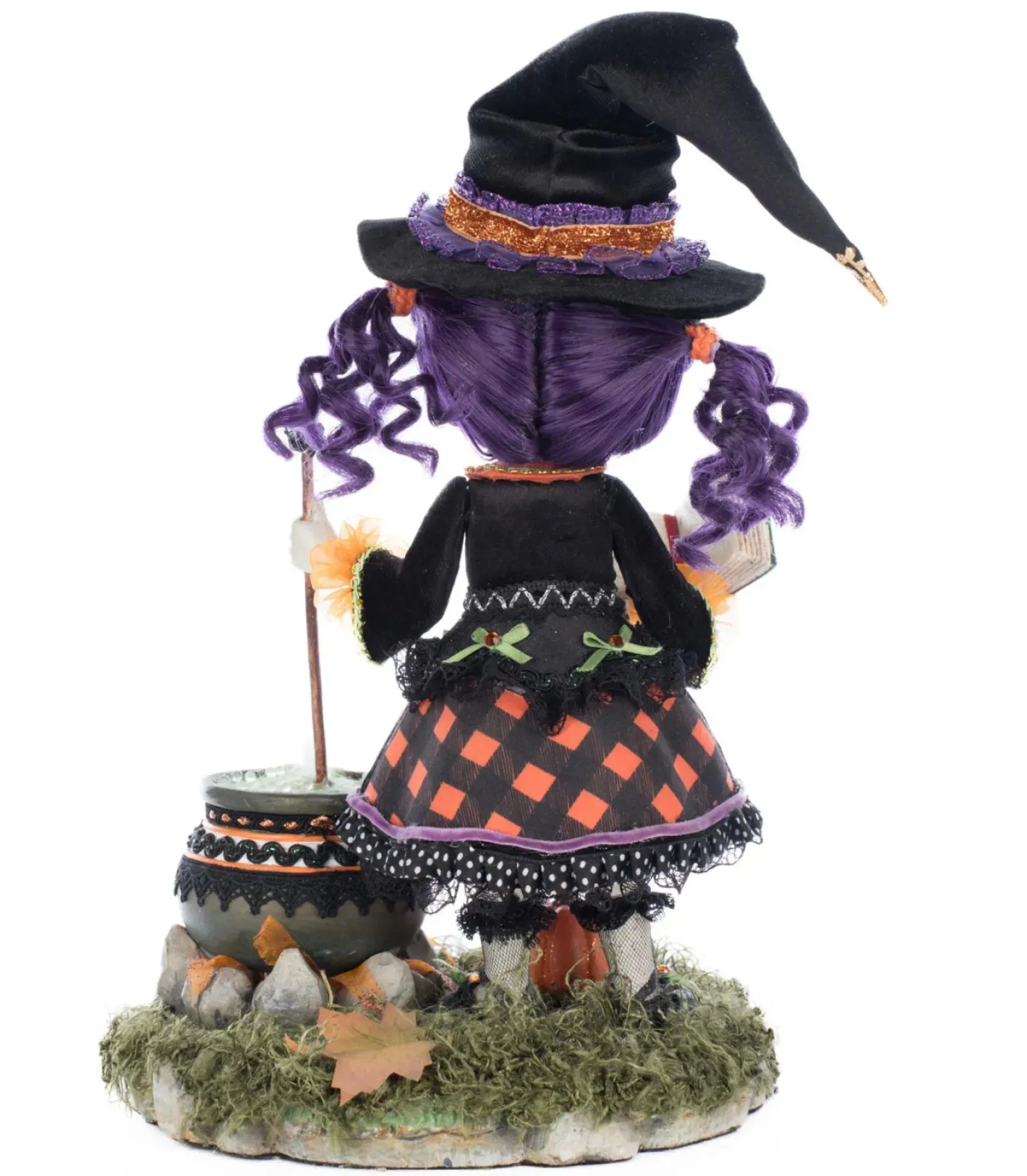 Double, double, toil and trouble—Poppy Broomson is brewing up some Halloween magic! This charming 11.5″ tabletop decoration from Katherine’s Collection features little witch Poppy with a ghostly pale complexion, bright green eyes, a wide mischievous smile, and curly purple pigtails. Topped with a floppy witch’s hat, she wears a black dress adorned with vibrant embroidery, layers of tulle, and festive black and orange plaid. In one hand, she clutches her trusty spell book, while the other stirs her bubbling cauldron with a staff. Full of personality and playful detail, Poppy is the perfect addition to your spooky season décor! Made by Katherine’s Collection. Dimensions: 7.5 × 7.5 × 11.5 in.