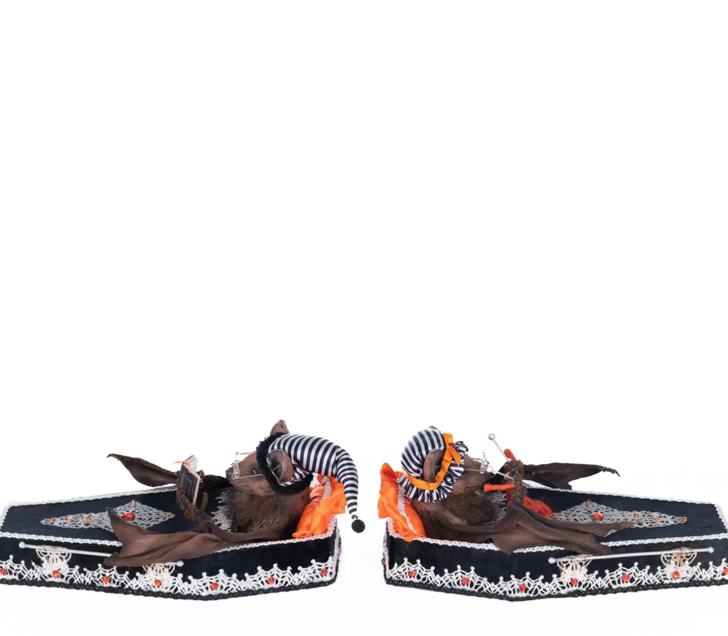 Even the creepiest critters need a cozy night in! Meet the Batson, a charmingly spooky pair tucked into their luxurious black coffin bed, complete with silver embroidered details, sparkling orange jewel accents, and a ruffled orange satin pillow for ultimate undead comfort. One bat is curled up with a tiny black book, while the other stays busy knitting a whimsical orange yarn web with miniature needles — the perfect touch of personality and playfulness. With their folded wings and peaceful expressions, these two are all about spooky self-care! Sold as a set of 2, this adorable duo adds a fun and quirky twist to your Halloween décor. Made by Katherine’s Collection. Dimensions: 14.25 × 8 × 4.5 in. Item #: 28-528681