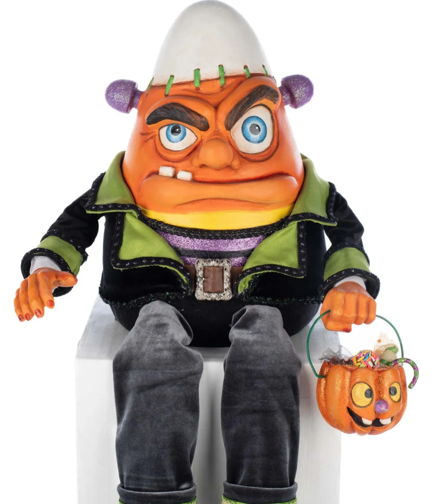 Someone’s a little salty… and sweet! Meet Frankie Corn, the crankiest candy corn in town—ready to perch on your shelf and scowl his way through Halloween! This grumpy orange and yellow candy corn character features a stitched-on white candy tip, purple glitter gumdrops for ears, and a perpetually unimpressed expression. He’s dressed in a black jacket and dark grey pants accented with light green trim, a brown leather belt, and chunky platform boots to complete his delightfully moody look. In one hand, Frankie holds a tiny jack-o’-lantern candy bucket, overflowing with colorful treats—though he’s clearly not in the sharing mood! Perfect for ledges, shelves, or tabletops, Frankie Corn adds a quirky, whimsical touch to your Halloween collection. Made by Katherine’s Collection. Dimensions: 12.5 × 10 × 19.5 in. Item #: 28-528641