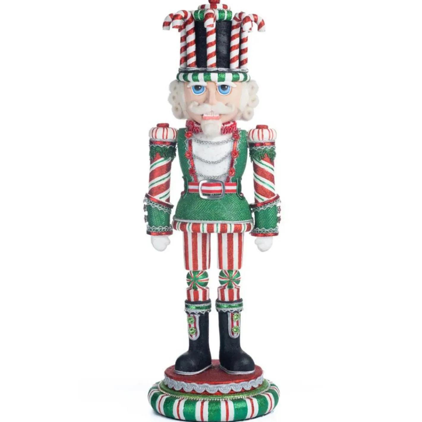 This blue eyed beauty is here for the party, the Christmas party that is! He has a beautiful red and green uniform on with sequined texture and peppermint candy stripes! He’s accented with plenty of red and green jewels and silver glitter chains. And the center of the show is his black hat lined with colorful candy canes topped with stacked peppermint candies! Made by Katherine’s Collection. Made of paper mache, resin, and fabric. Dimensions: 6 × 6 × 18.25 in.Â
