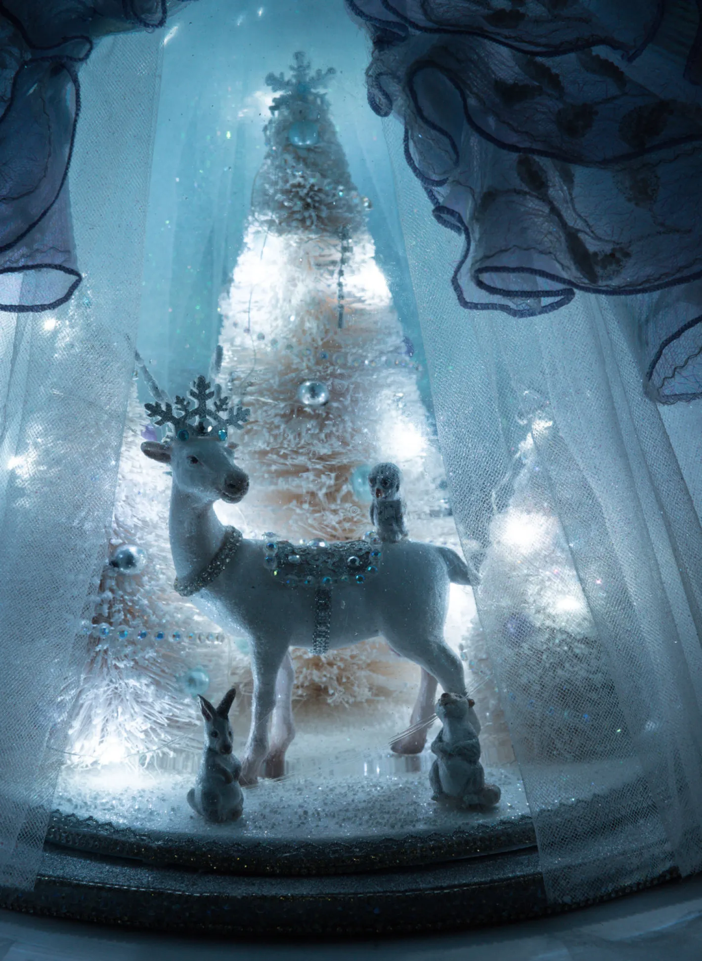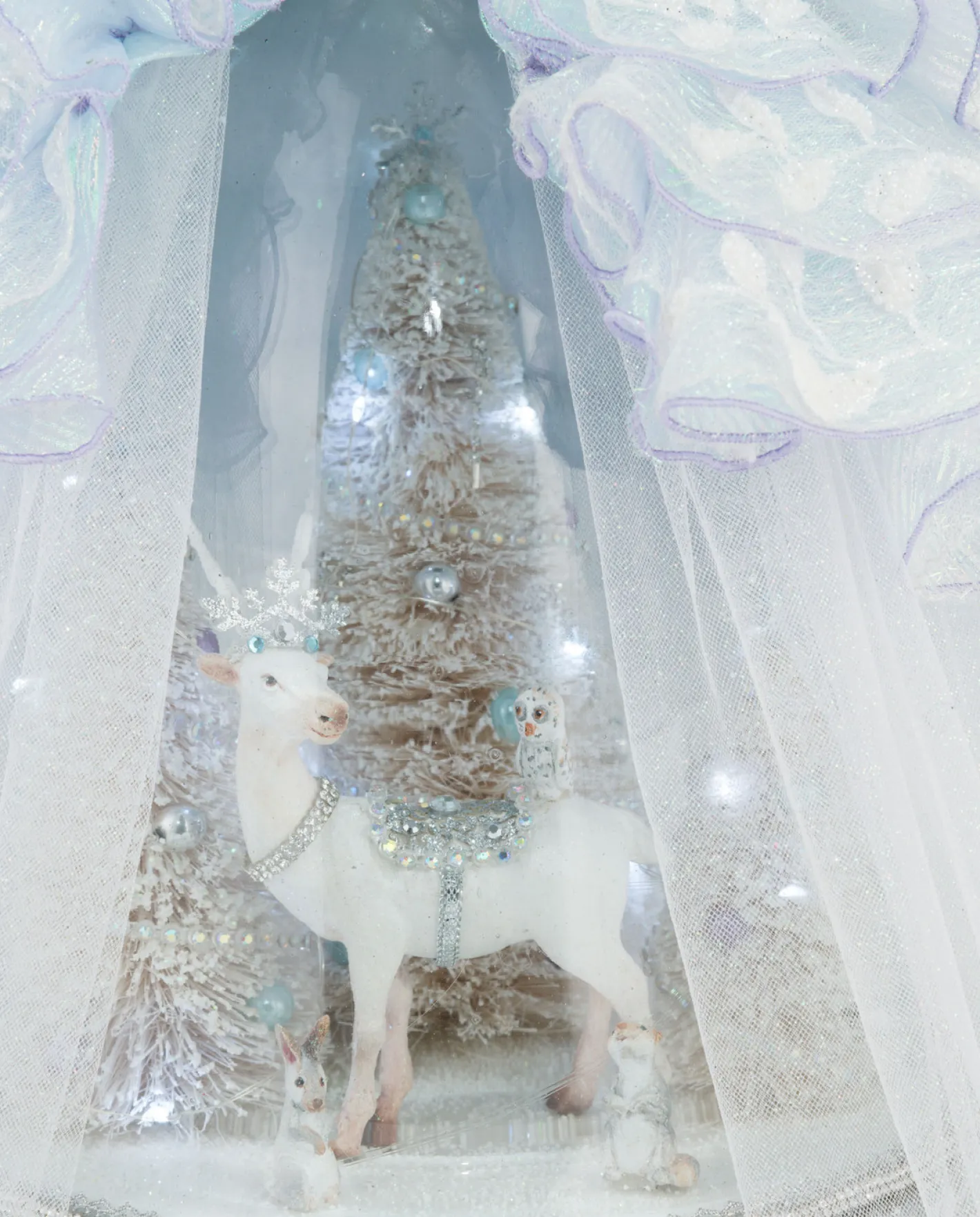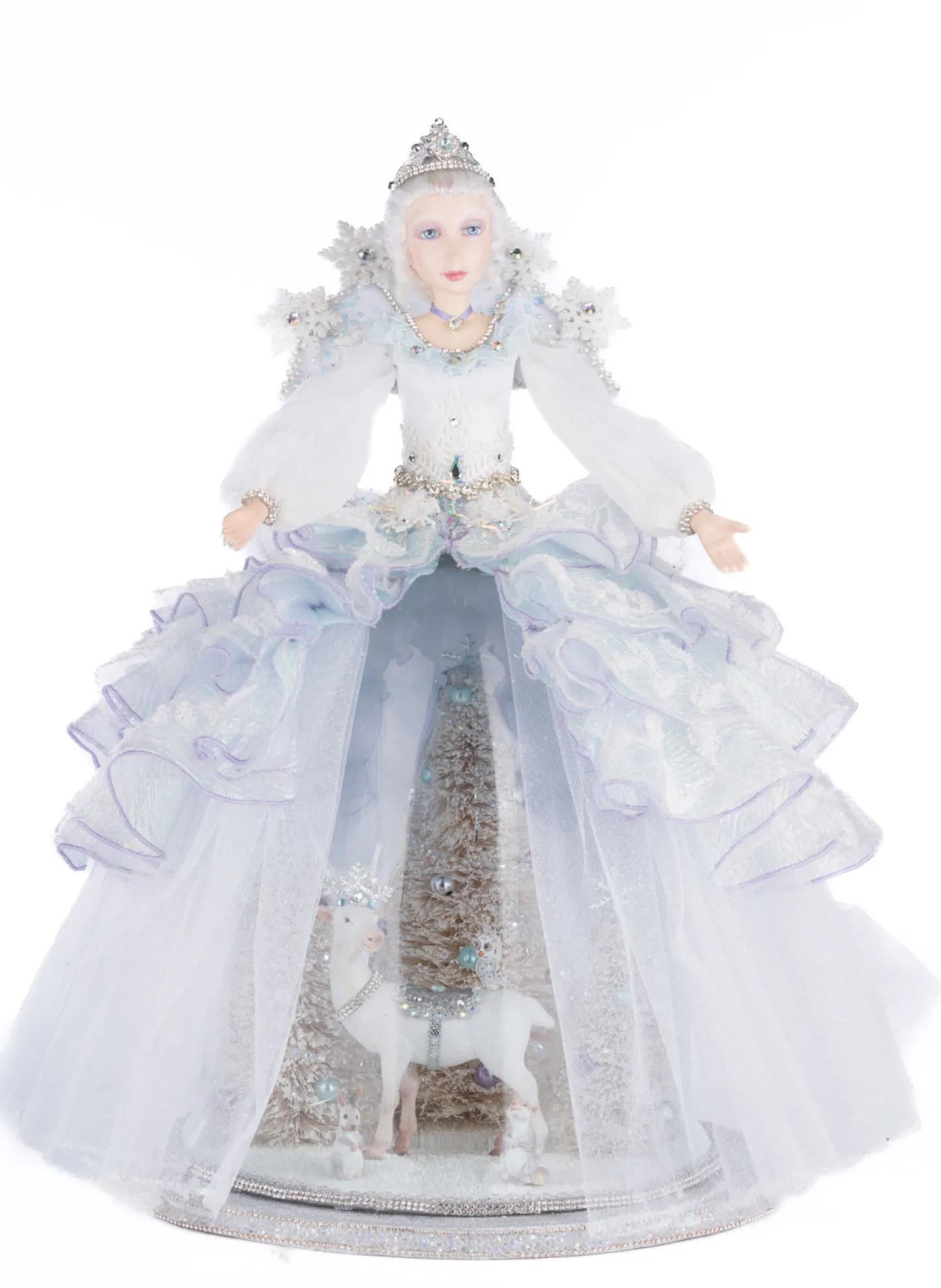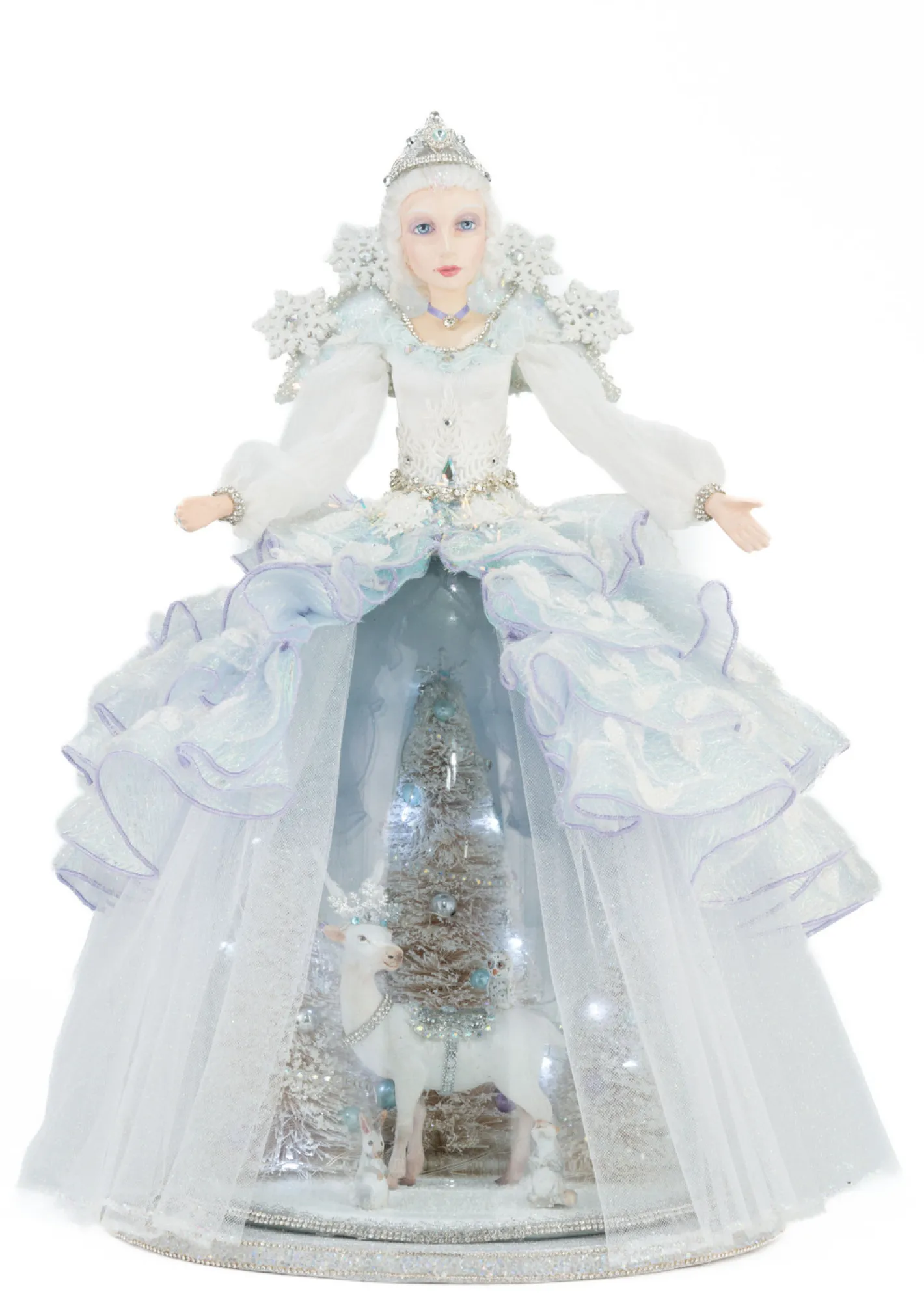 Queen Crystalline has a stunning head of silvery white hair twisted up into a bun with a silver crown of jewels and a large collar of silver and snowflakes around her shoulders. Light blue lace decorates the neckline of her white gown complete with beaded balloon sleeves, snowflake detailed waist, and tiered skirt of blueish purple lace tulle. The skirt parts in the front to reveal a glass cloche holding a wintery wonderland with woodland creatures and a decorated bottle brush tree! The lights wrapped around the tree in the cloche light up and are sure to make the most beautiful addition to your mantle this holiday! Made by Katherine’s Collection. Dimensions: 13 × 13 × 20 in.Â