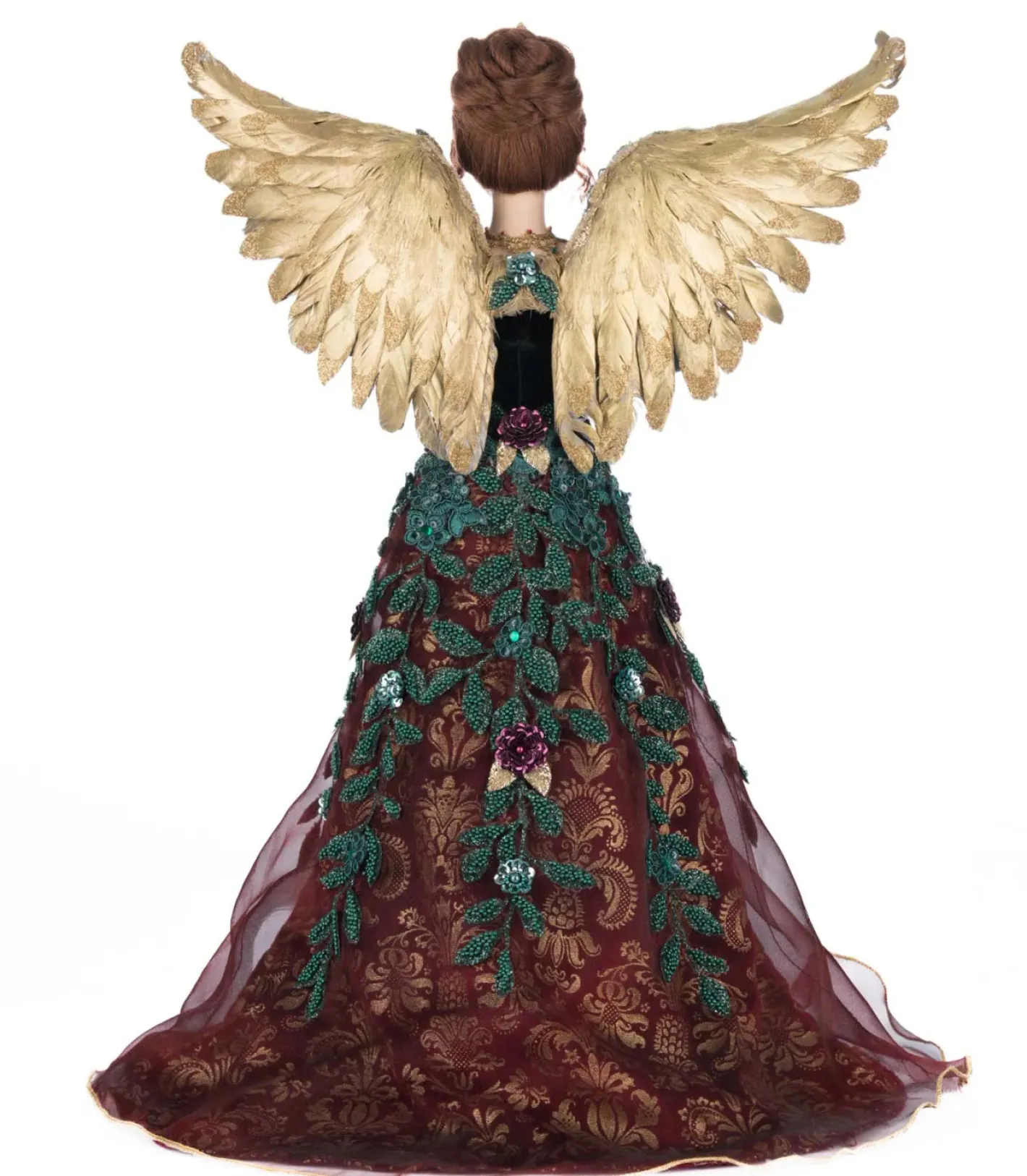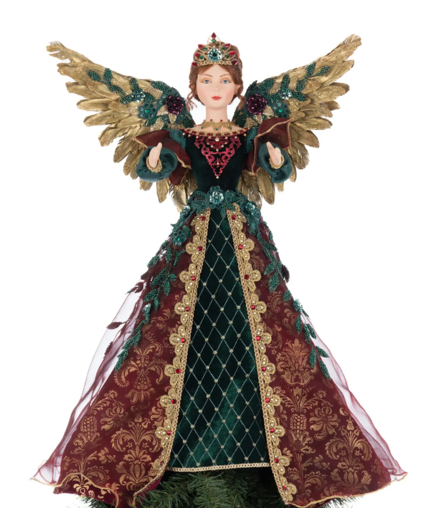 Scarlett the Angel brings timeless elegance and celestial charm to the top of your Christmas tree. Her radiant face features painted red lips, striking green eyes, and reddish-brown hair styled into a graceful bun crowned with a jeweled golden tiara. Her golden feathered wings shimmer with emerald green beading, perfectly complementing her deep green and red gown. The dress features ruffled dark red sleeves, intricate red embroidery across the bodice, and a green beaded belt at her waist. Flowing beneath is a layered dark red overskirt with soft gold scrollwork, trimmed with gold and topped with a sheer red tulle overlay. A truly regal finishing touch for your holiday décor. Made by Katherine’s Collection. Dimensions: 18.5 × 17 × 21 in. Item #: 28-528780