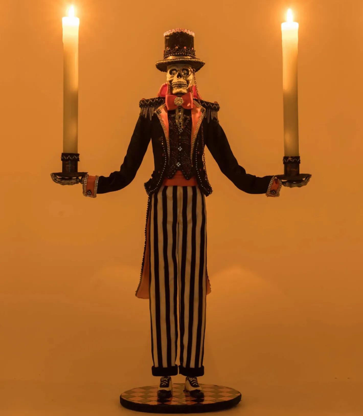 Cast a haunting glow over your Halloween display with this striking Macabre Skeleton Candelabra from Katherine’s Collection! This eerie figure stands tall in striped trousers and a dramatic long petticoat, complete with bright orange lapels, metal chains, and sparkling jewel accents for an extra touch of ghoulish glamour. With both bony arms extended, the skeleton holds taper candle holders at each side—perfect for adding a flickering, flameless light to your haunted home. Whether placed on a mantle, entryway, or dining table, this chilling candelabra makes a bold and stylish statement. A must-have for those who love their Halloween decor a little bit spooky and a whole lot sophisticated. Candles included. Batteries not included. Made by Katherine’s Collection. Dimensions: 14.5 × 5 × 22.5 in. Item #: 28-528667
