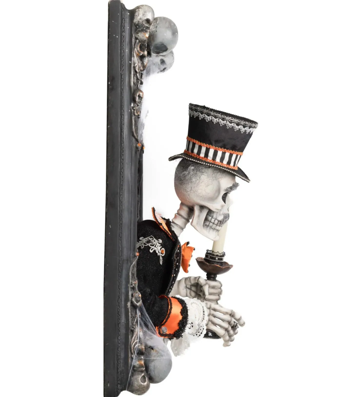 Honor the dearly departed… with a twist! Great Grandpa Macabre isn’t your typical family portrait. This eerie wall piece from Katherine’s Collection features a black ornate frame adorned with tiny orange jewels and mini skulls, perfectly setting the stage for what lies within. At the center, the “portrait” bursts to life—literally—with a 3D skeletal figure that’s far from ordinary. Great Grandpa flaunts ruby-red jeweled eyes, a dashing grey handlebar mustache, and a bedazzled ribcage peeking from beneath his sharp black suit jacket. A classic top hat tops off his ghostly ensemble, and in one skeletal hand, he holds a candlestick, ready to light the way through the haunted halls. A playful blend of creepy and classy, this wall piece makes the perfect statement for your Halloween decor—because every haunted house needs a little family history! Candle included batteries not included. Made by Katherine’s Collection. Dimensions: 21.25 × 10 × 24.75 in. Item #: 28-528665