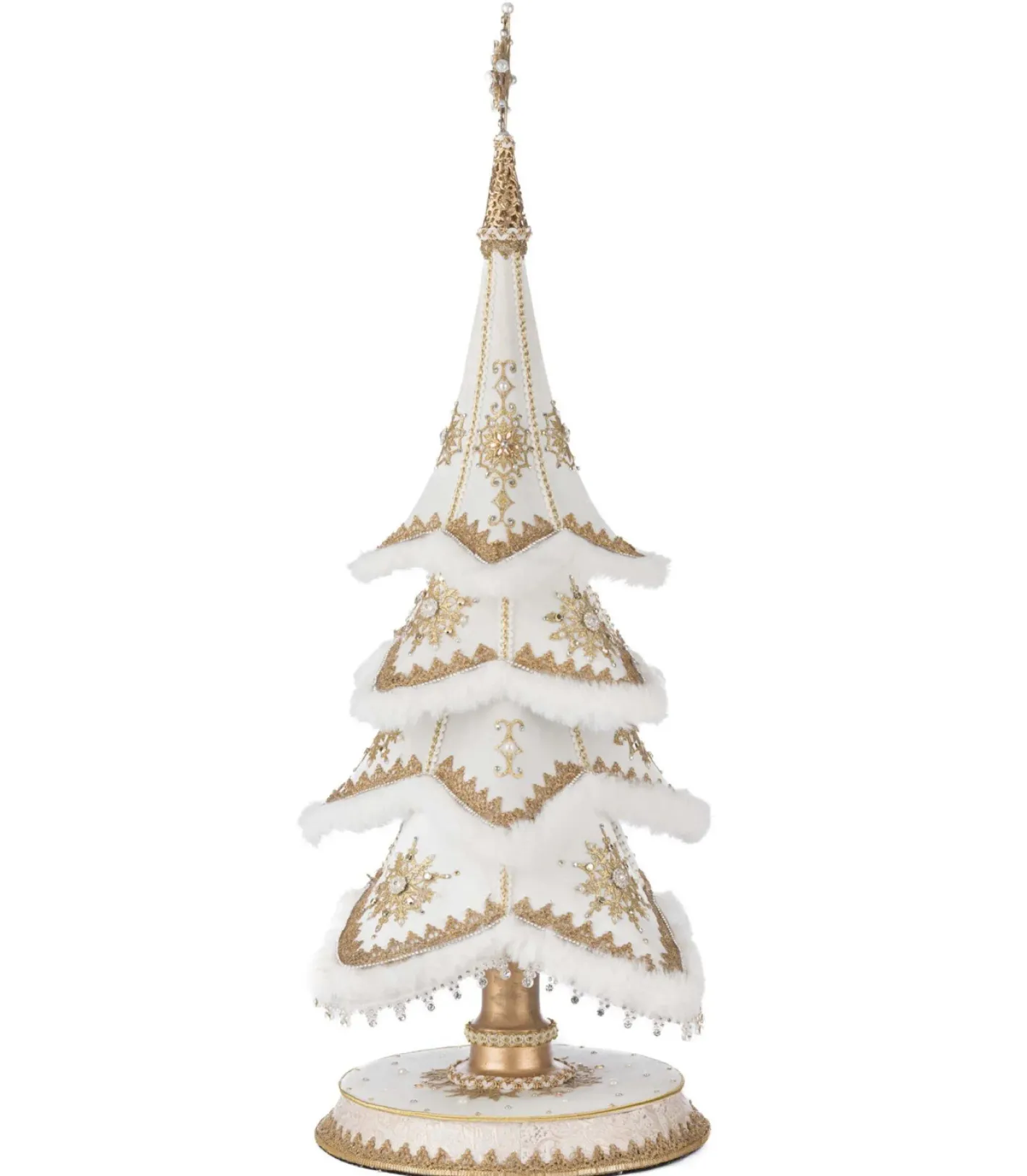 Add a touch of timeless elegance to your holiday décor with the Katherine’s Collection 28.5″ Golden Bells of Brilliance Tabletop Tree. This beautifully tiered tree is dressed in luxurious white velvet, with each layer trimmed in soft white faux fur and detailed with exquisite gold embroidery. Adorned with delicate gold snowflakes featuring clear jeweled centers that evoke the charm of vintage brooches, this piece sparkles with sophistication. The base tier is finished with tiny glistening beads, while a dainty square brooch crowns the top. Perfect for mantels, tabletops, or entryway displays, this stunning tree brings graceful brilliance to any Christmas setting. Made by Katherine’s Collection. Dimensions: 13.5 × 13.5 × 28.5 in. Item #: 28-528758