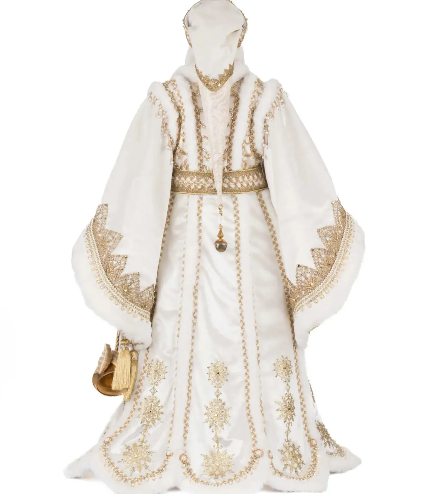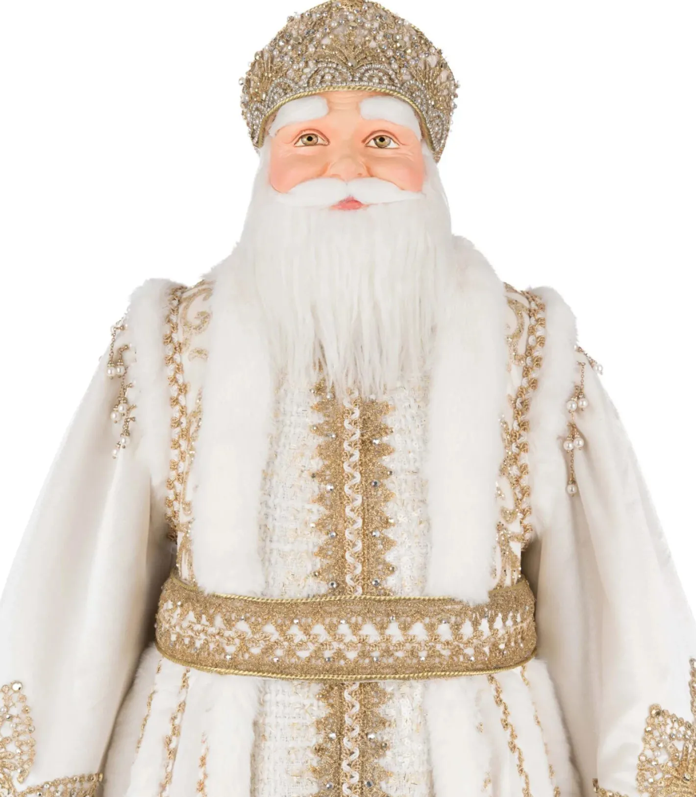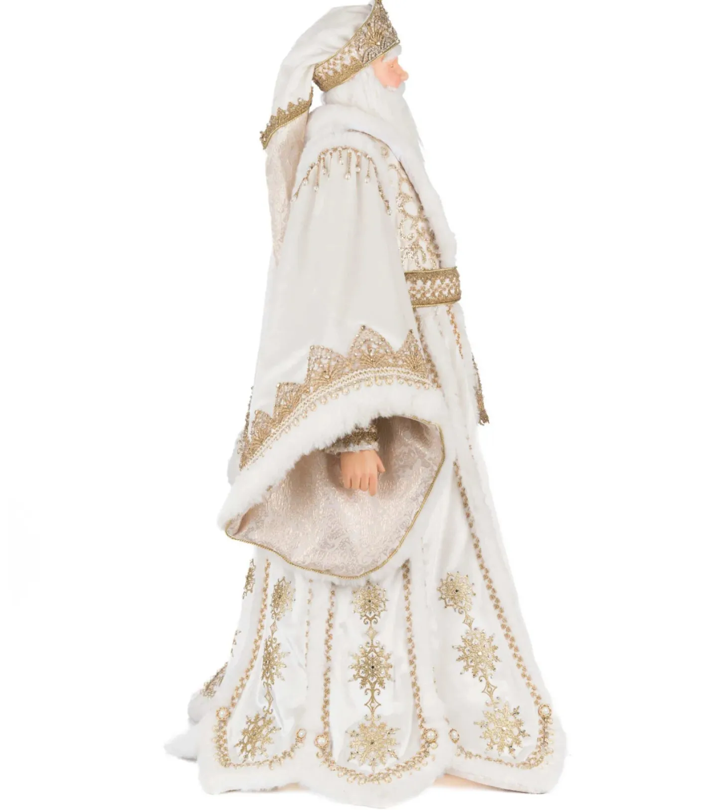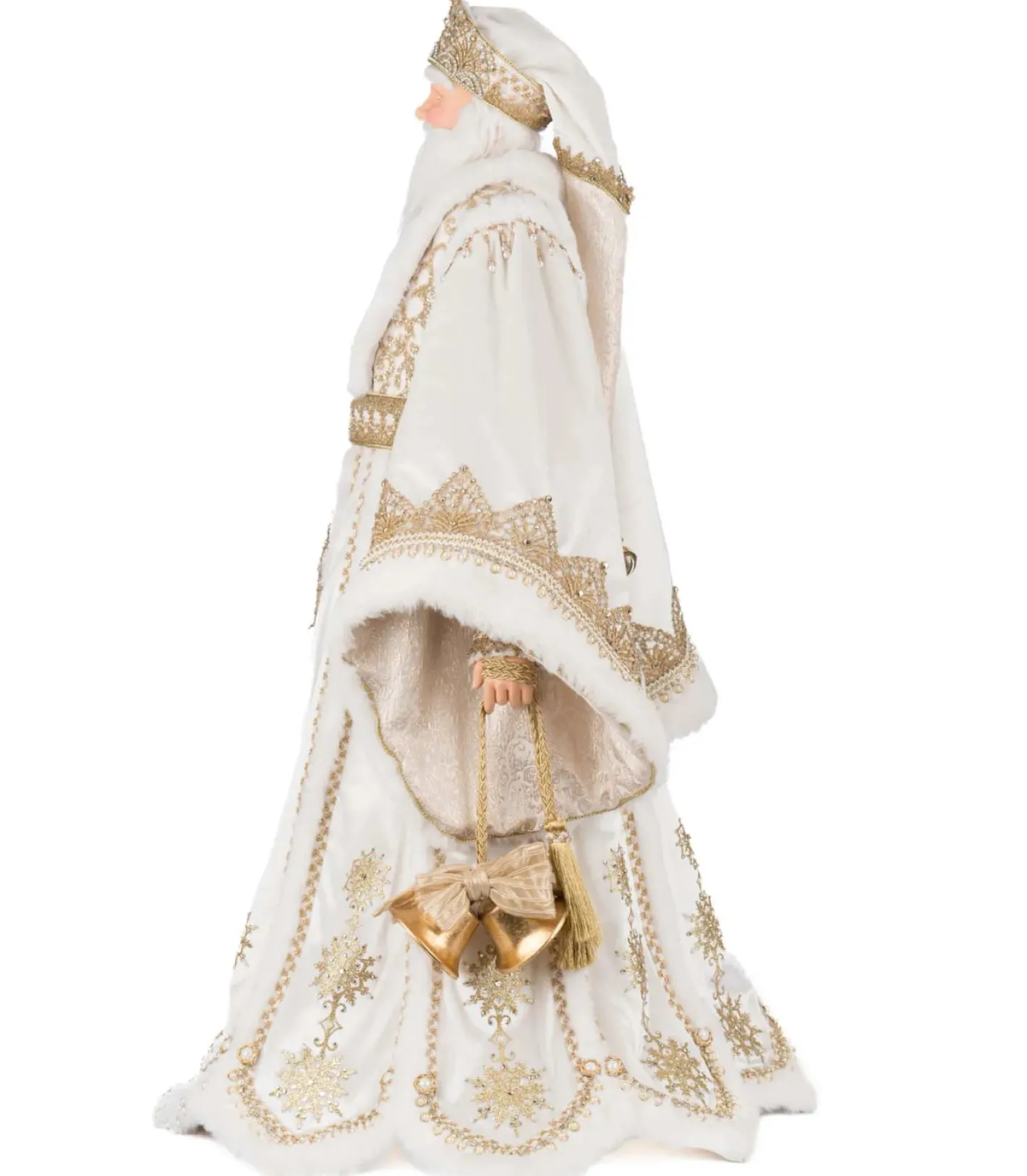 Dressed in regal splendor, the Katherine’s Collection 36″ Bells of Brilliance Golden Leaf Santa Doll brings opulence and holiday magic to your décor. Santa wears a majestic floor-length white and gold coat, richly embroidered with shimmering gold thread and adorned with sparkling jewels that echo the brilliance of his ornate golden crown. Beneath, his coordinating shirt and gold-striped trousers add layers of texture and elegance, while his plush white and gold fur-trimmed boots complete the ensemble. With a commanding presence and radiant style, this Santa is sure to be the centerpiece of your holiday celebration—turning heads and spreading joy wherever he stands. Made by Katherine’s Collection. Dimensions: 20.5 × 20.5 × 36 in.