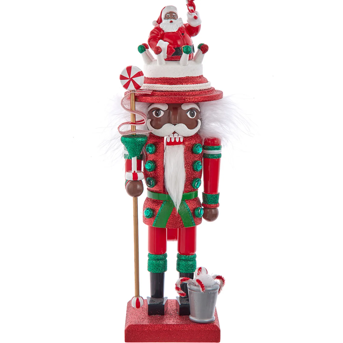 Ho! Ho! Ho! Merry Christmas! This nutcracker features a beautiful red glittered jacket with green jewel buttons and a peppermint staff in hand! At his feet sits a small bucket filled with peppermint candies, and on his head sits a small Santa figure waving a candy cane in his hand! Made by Kurt Adler. Made of wood. Dimensions: 10″ tall.