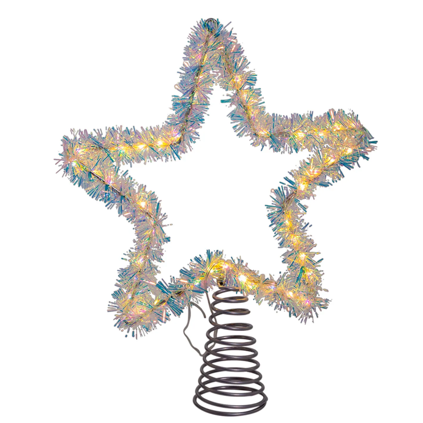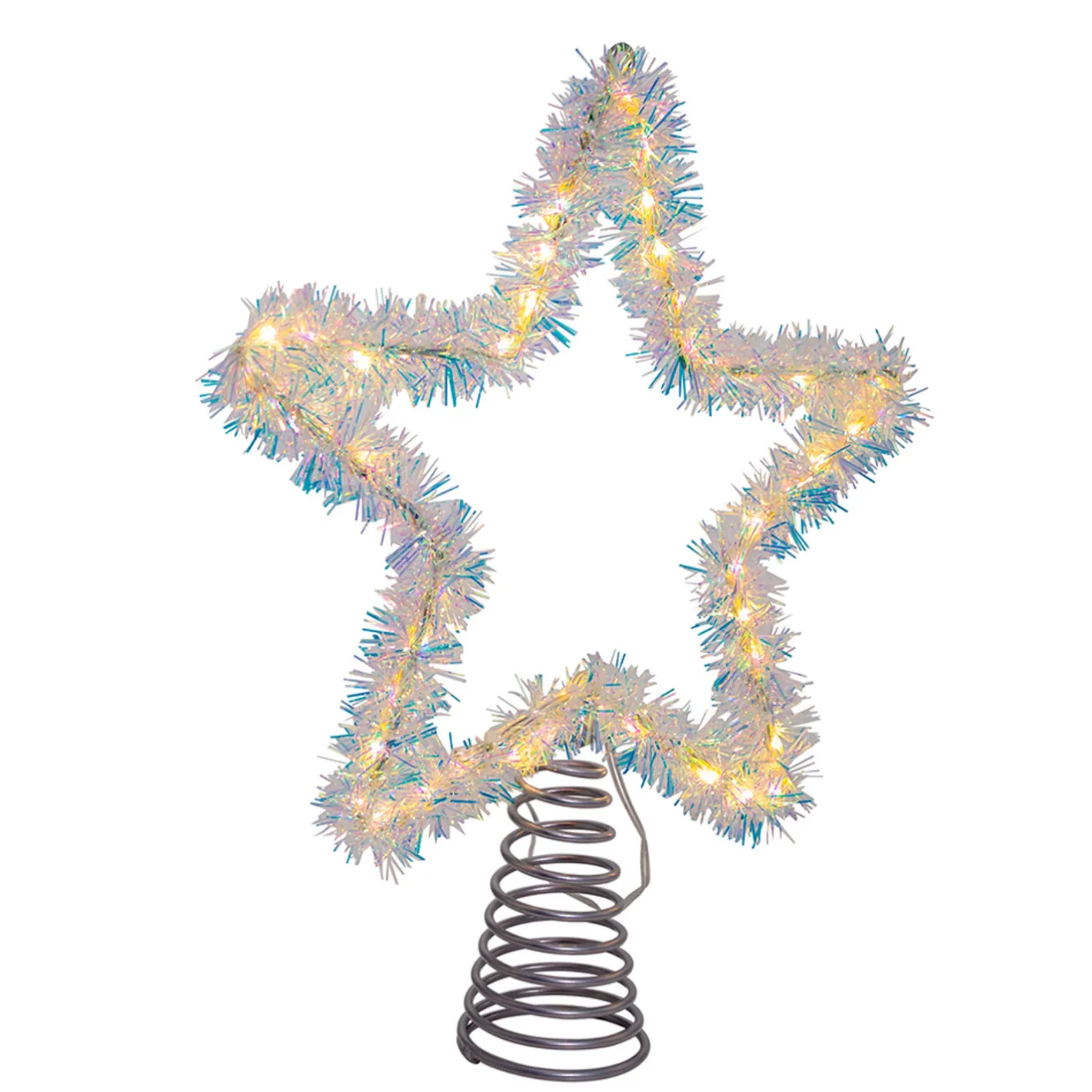 This gorgeous topper features a star wrapped in silver tinsel and lined with warm white lights! It gives a nice golden toned effect and add a vintage touch! Plug in. Twinkle feature. Indoor/outdoor use. Made by Kurt Adler. Made of metal. Dimensions: 12.2″ x 10.5″.