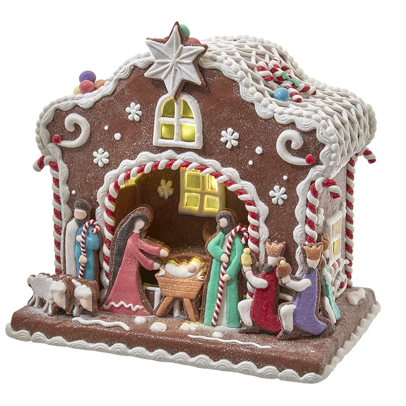 This unique nativity scene features a gingerbread house stable made of cookie walls and trimmed in white icing with an intricate pattern on the roof and dotted with rainbow candies with candy canes! The North Star on the front is covered in white icing. Just outside of the stable is the holy family covered in colorful icing! This is sure to look awesome on your mantle! Battery-operated; uses 3 “AAA” batteries (not included). Made Kurt Adler. Made of claydough. Dimensions: 12.5″ x 8.5″ x 12.5″. Item #: N1036