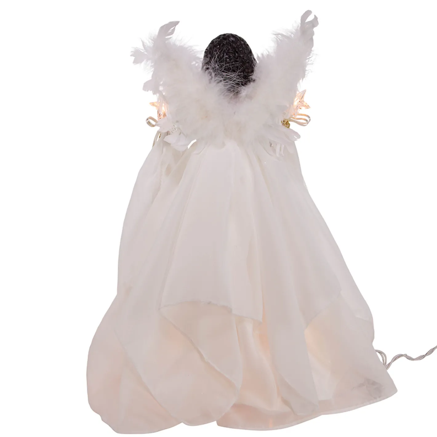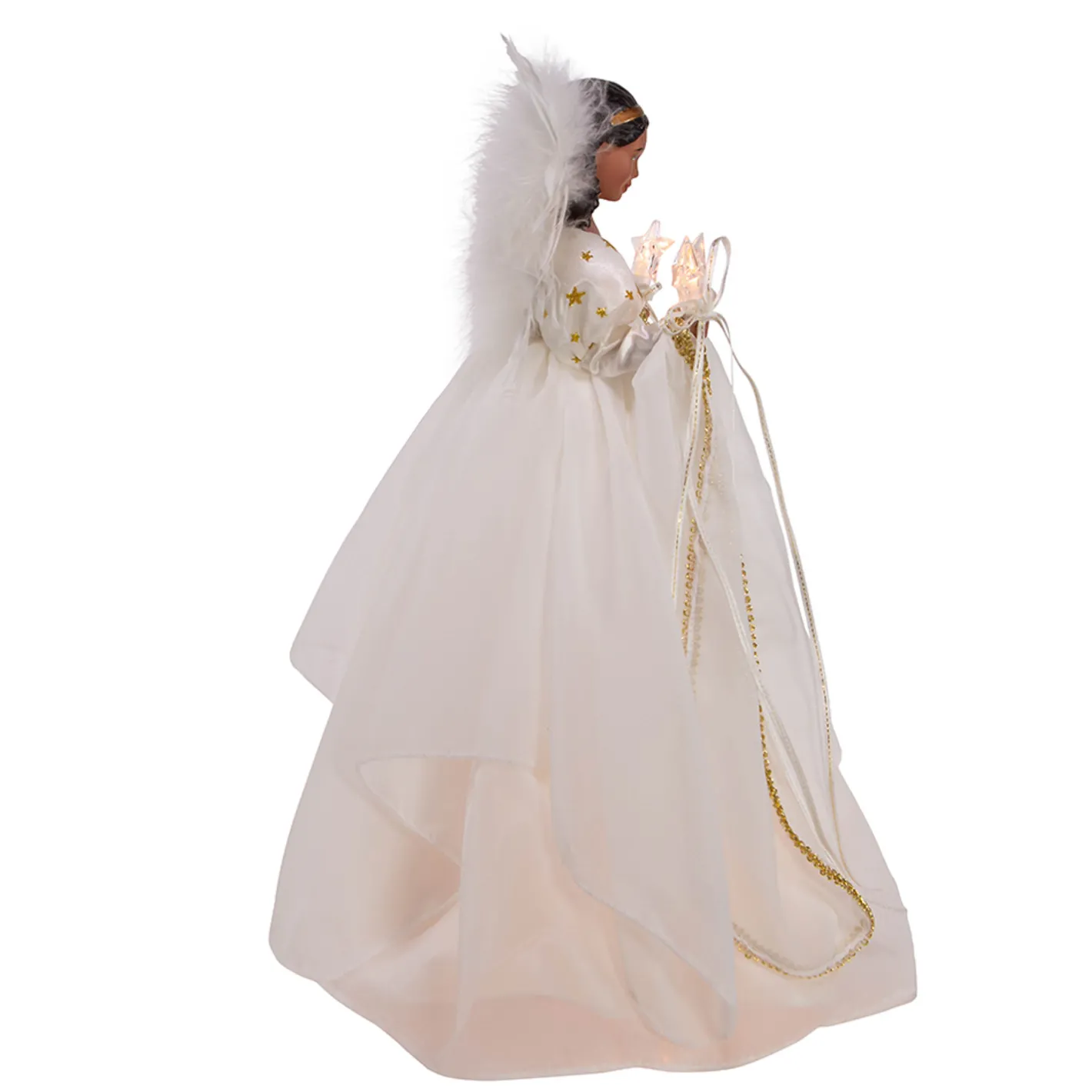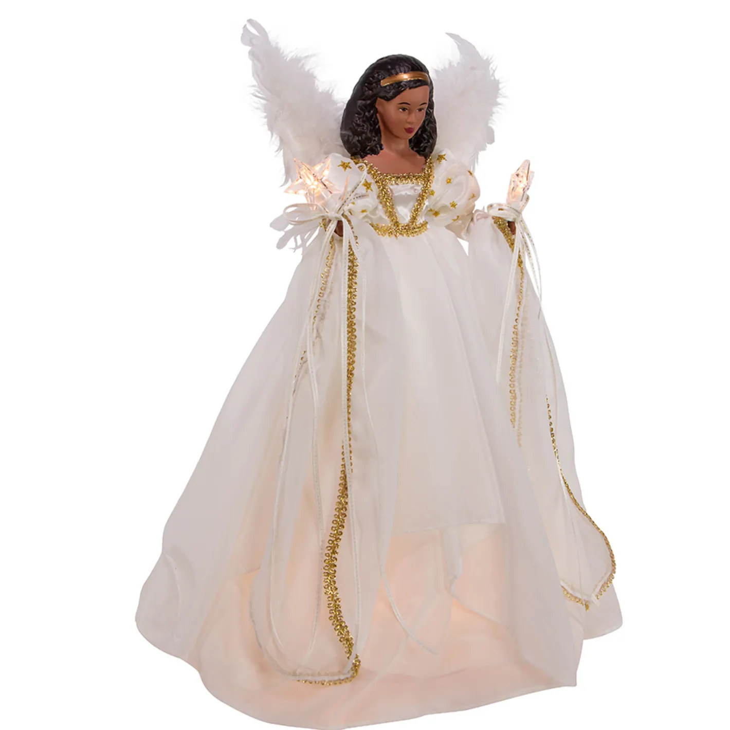 This stunning angel is ready to adorn your tree this holiday season! She has a beautiful white dress with gold stars and gold embroidery, in each hand she holds lighted stars, and behind her a pair of white feathered wings peek over her shoulders! Plug in. Made by Kurt Adler. Made of resin. Dimensions: 12″ tall.