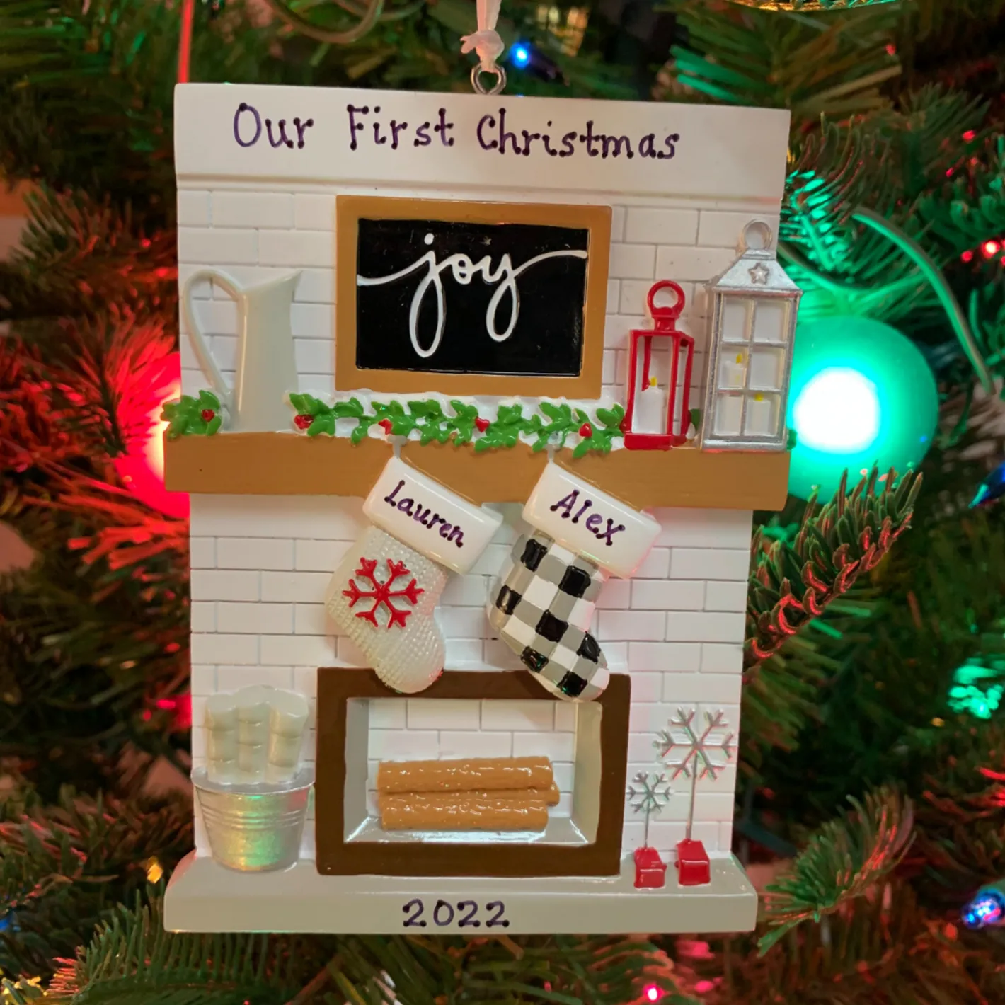 This fireplace is out of our dreams! It features a white brick wall with a thick wooden mantle lined with lanterns and a dainty garland. Two patterned stockings hang from the mantle above a fireplace! Get your names on each stocking and a Christmas sentiment at the top of the mantle! Made of resin. Dimensions: 5″ x 3.75″ x 0.5″.