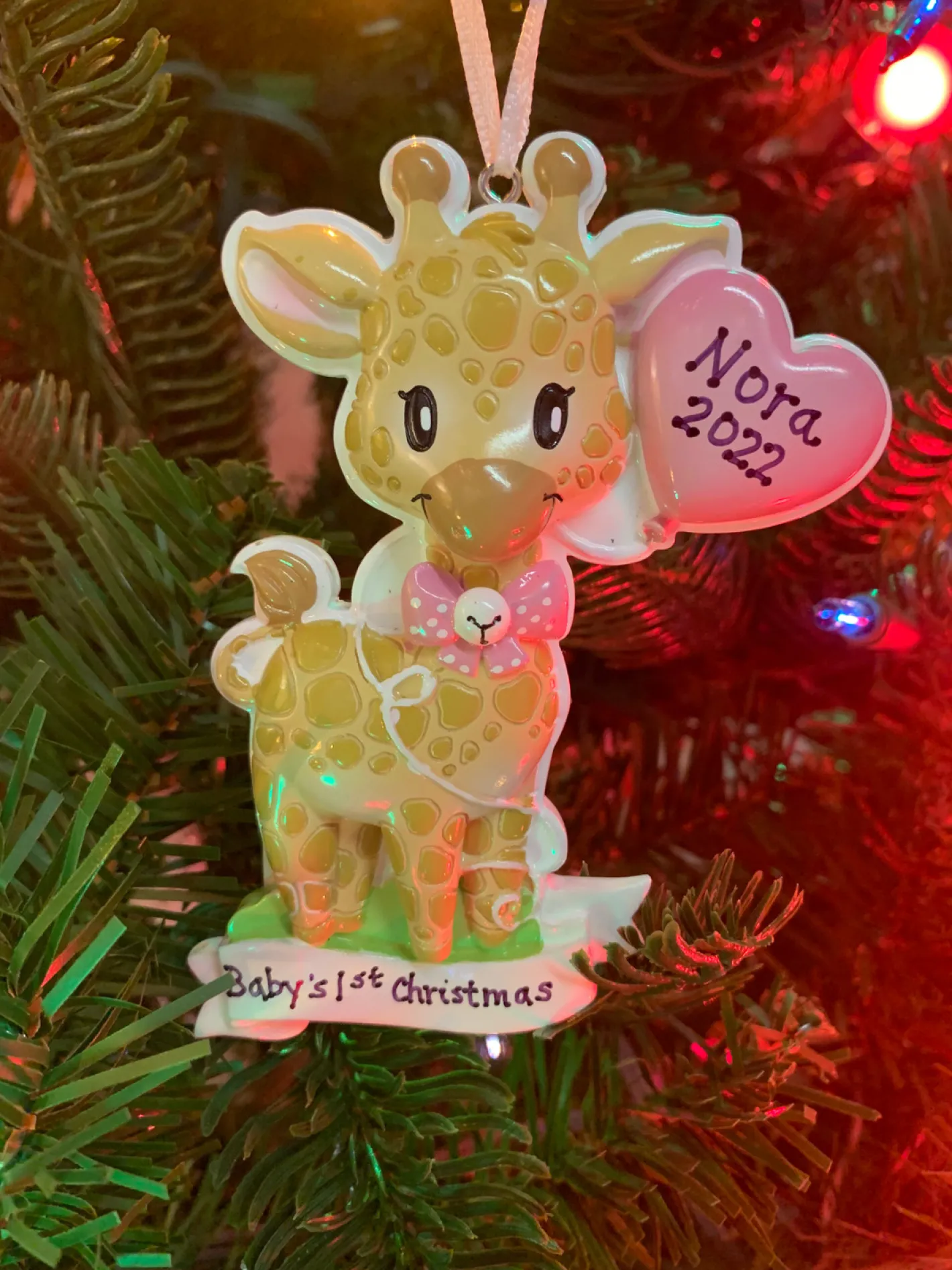 Celebrate your newest little bundle of joy this holiday season with this cute as can be ornament! It features a little yellow giraffe with a bright pink balloon and matching bowtie! Get your littles name on the ballon and the year on the banner for a fun keepsake! Made of resin.