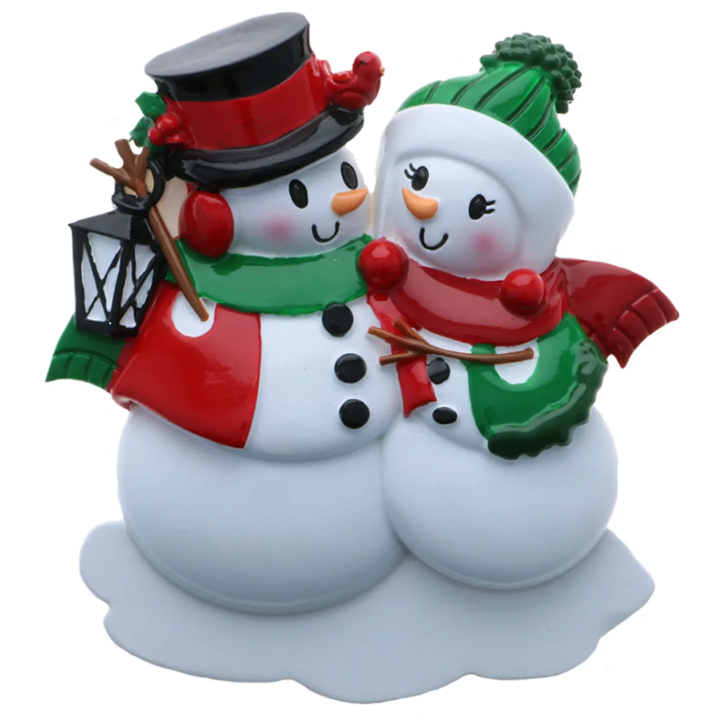 Snuggle up with your loved one this holiday season like this adorable couple! It features two snowmen with coordinating red and green Christmas vests and cozy hats while embracing each other. Get your names written on the hats of each snowmen and the year written at the bottom. Made of resin.
