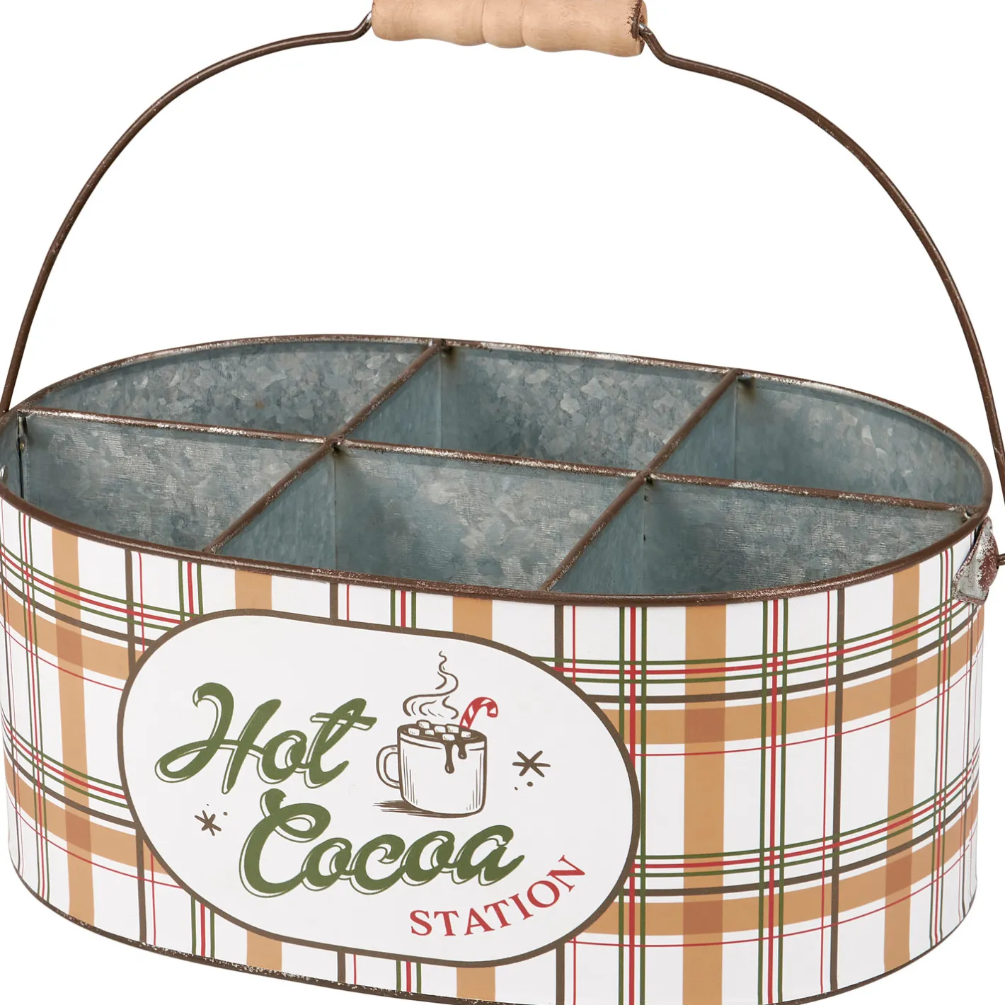 Assemble yourself a cute little hot cocoa station for your guests this holiday season! This caddy features 6 compartments to fill with candy canes, hot chocolate, pretzel rods, spoons, or whatever types of goodies you want! The outside is decorated with a tan and red and green plaid design with a small oval hot cocoa station logo in green font with a small mug! Items in caddy not included. Made by Primitives By Kathy. Made of metal. Dimensions: 12″ x 5.50″ x 8″.Â