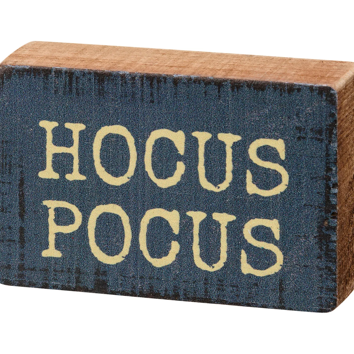 This sign features a wooden block with Hocus Pocus printed on burlap! Perfect to place up on your mantle or on your coffee table! Made by Primitives By Kathy. Made of wood. Dimensions: 3″ x 2″ x 1″.