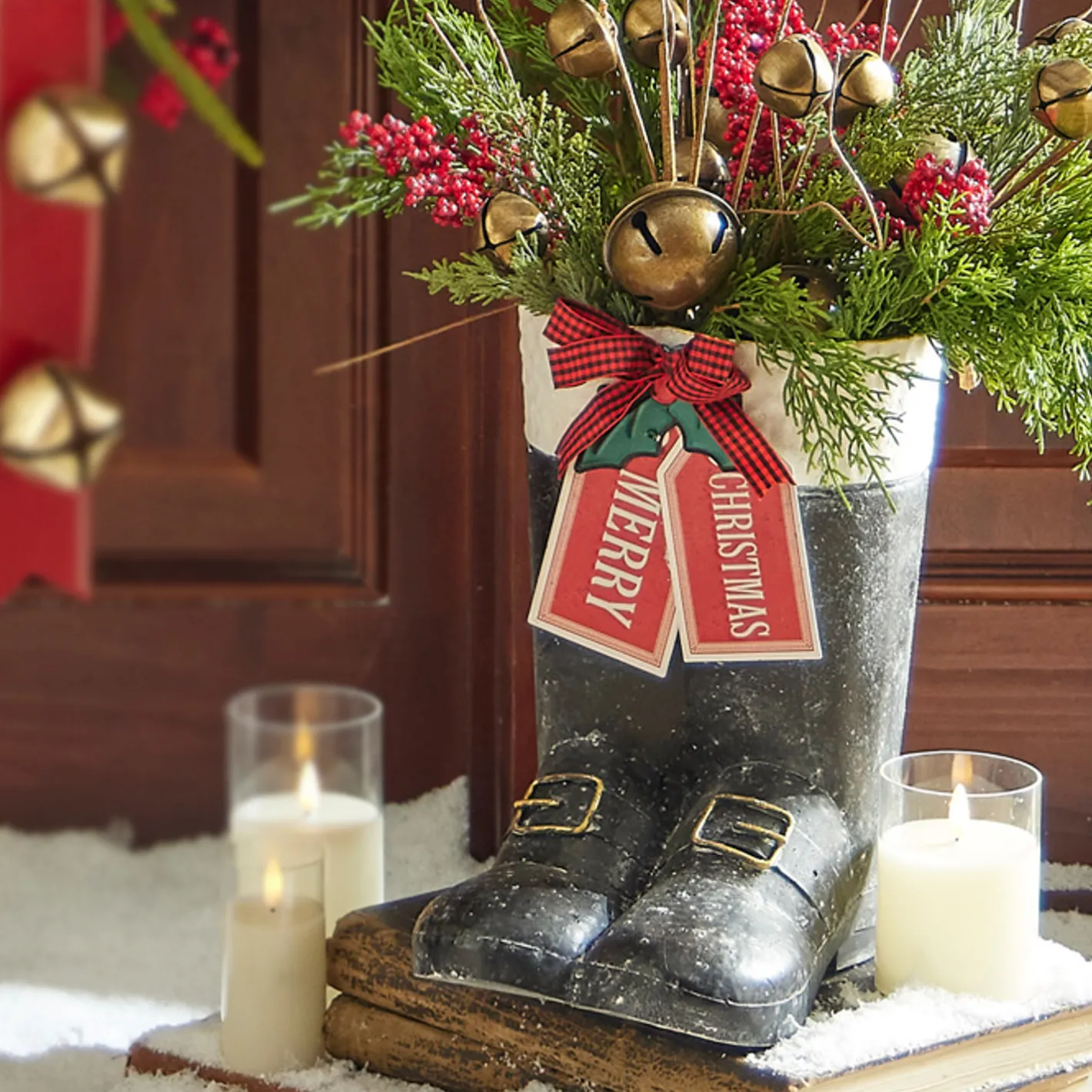 Looks like Santa has decided to take a load off and relax! He’s left his boots by the door! This adorable decoration features a pair of black boots with gold buckles, white trim, two red tags that read “Merry Christmas”, and a holly berry with a plaid bow! Perfect to load up with your favorite greenery and place by your door for an effortless decoration! Made by Raz Imports. Made of metal. Dimensions: 9″ L X 6″ W X 11.5″ H.Â