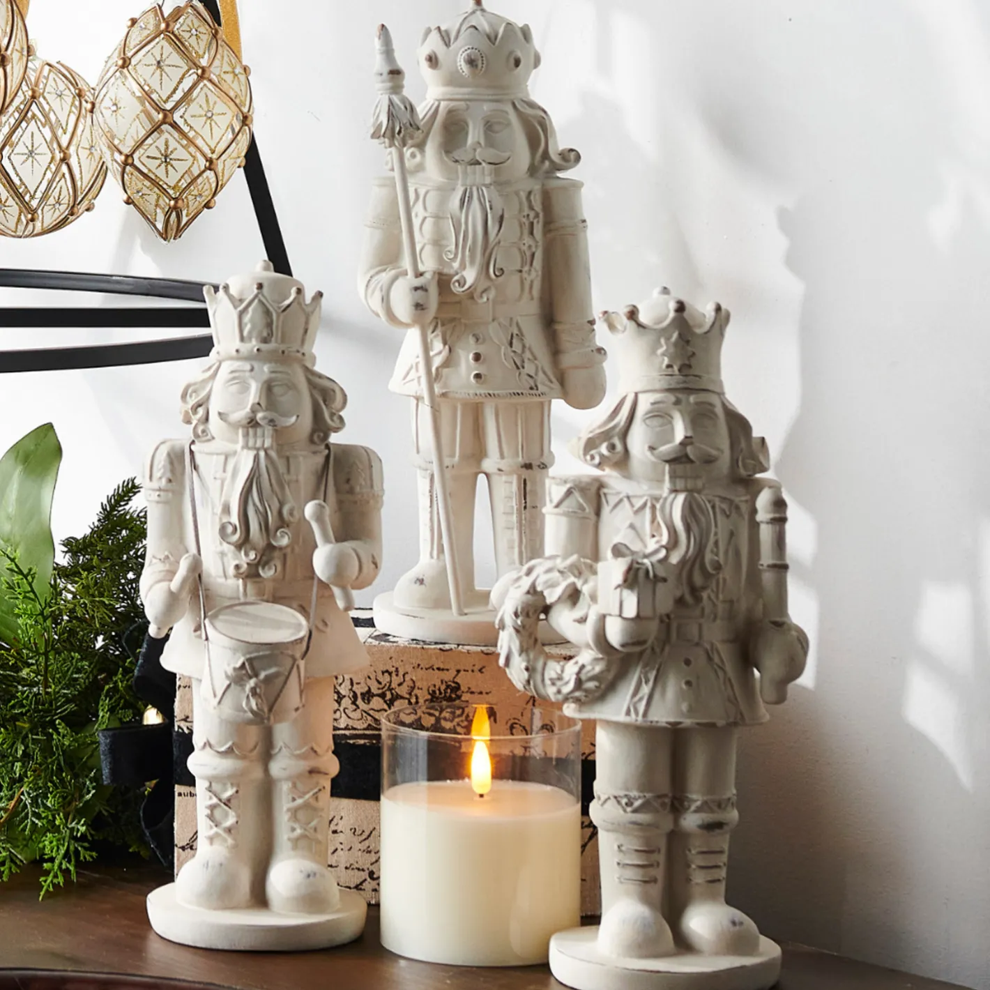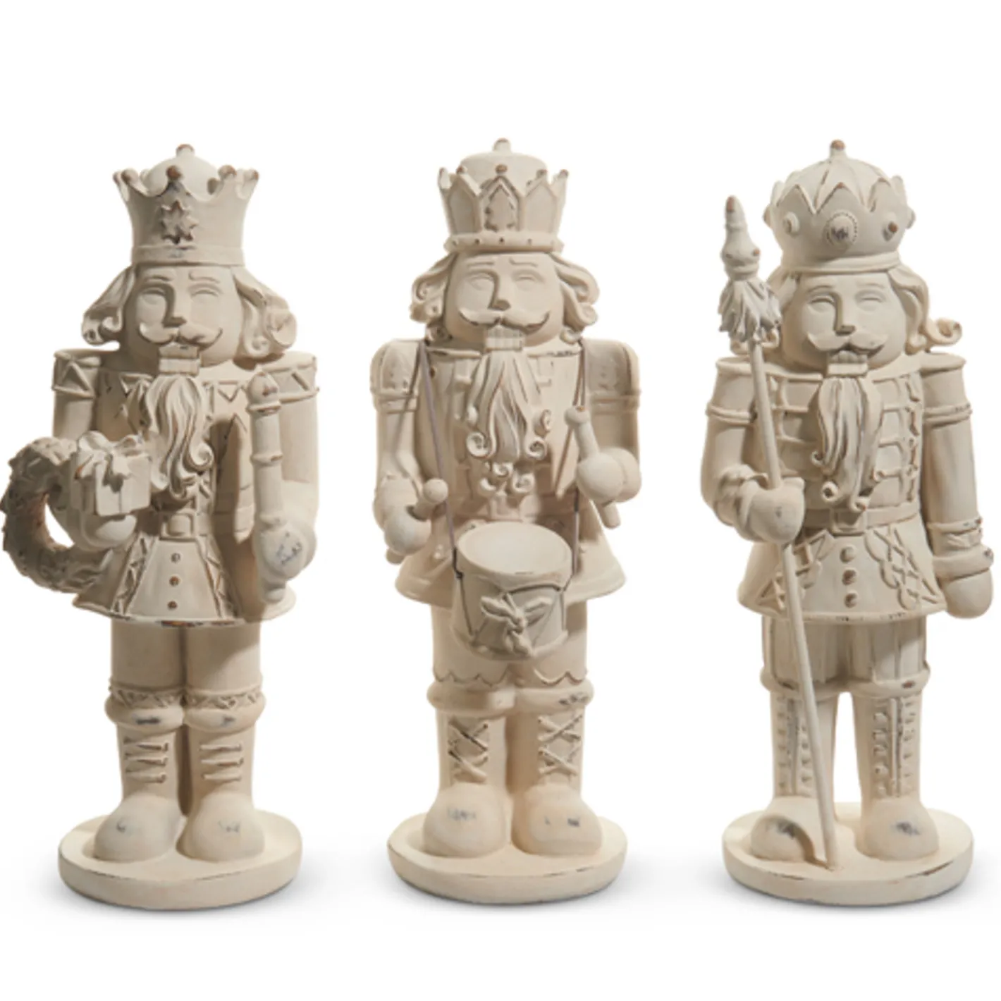 These nutcrackers feature a soft ivory finish with a distressed whitewashed look that gives them timeless charm. Each is topped with a regal crown and carries a festive item—a drum, a wreath, or a staff. Perfect for displaying on your mantle, entryway table, or bookshelf, they bring a touch of rustic elegance to your Christmas décor. Sold as a set of 3. Made by Raz Imports. Made of resin. Dimensions: 4.5″L X 4″W X 11.75″H; 5.25″L X 4.5″W X 11.75″H; 4″L X 4.75″W X 11.75″H.Â