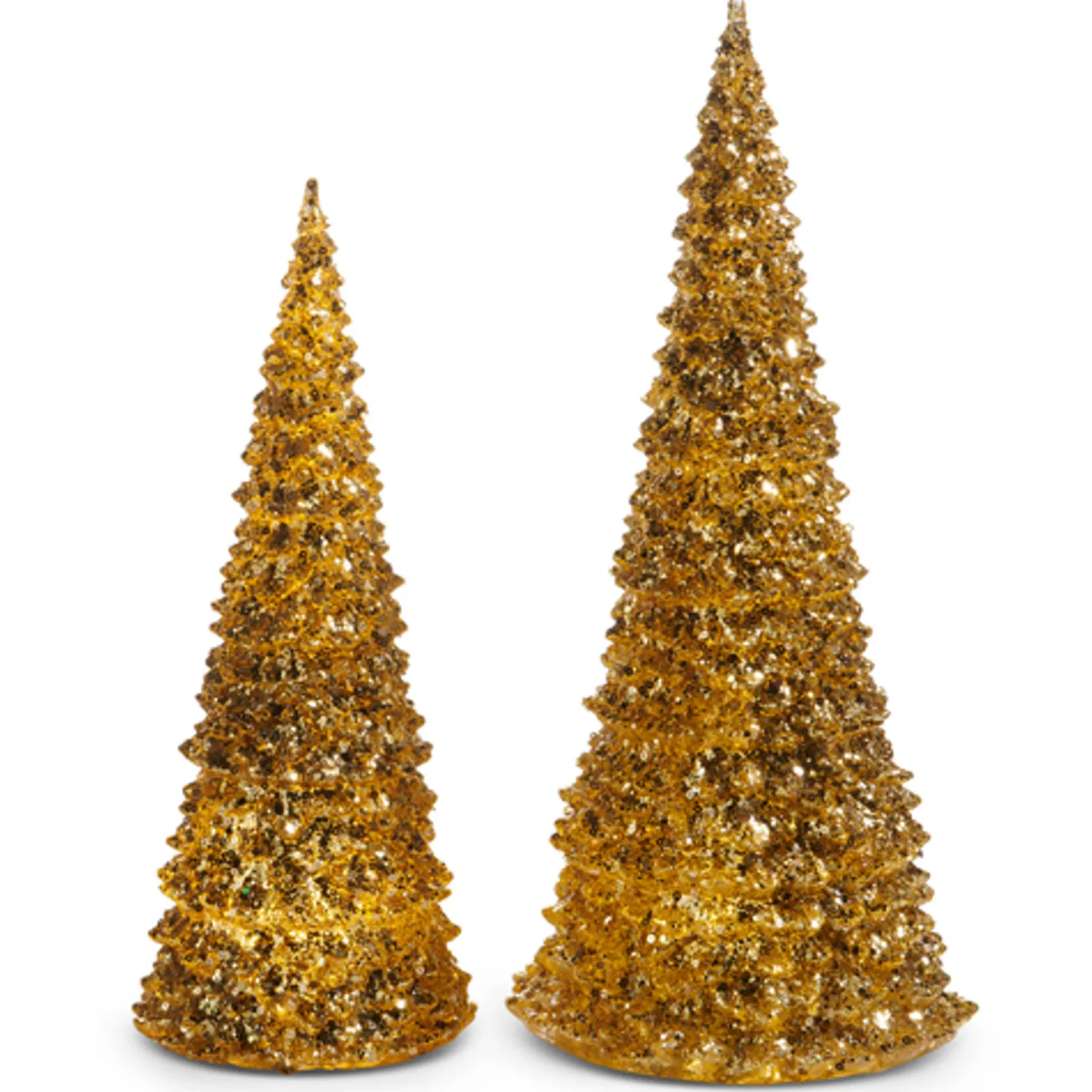 Brilliant metallic gold trees are sure to steal the show this Christmas! Turn them on and watch them sparkle! They are perfect to place on your mantle, on your coffee table, or on your counter! Requires 3 AA Batteries, not included. Made by Raz Imports. Made of plastic and mica. Dimensions: 7″D X 15.25″H; 5″D X 12.5″H.