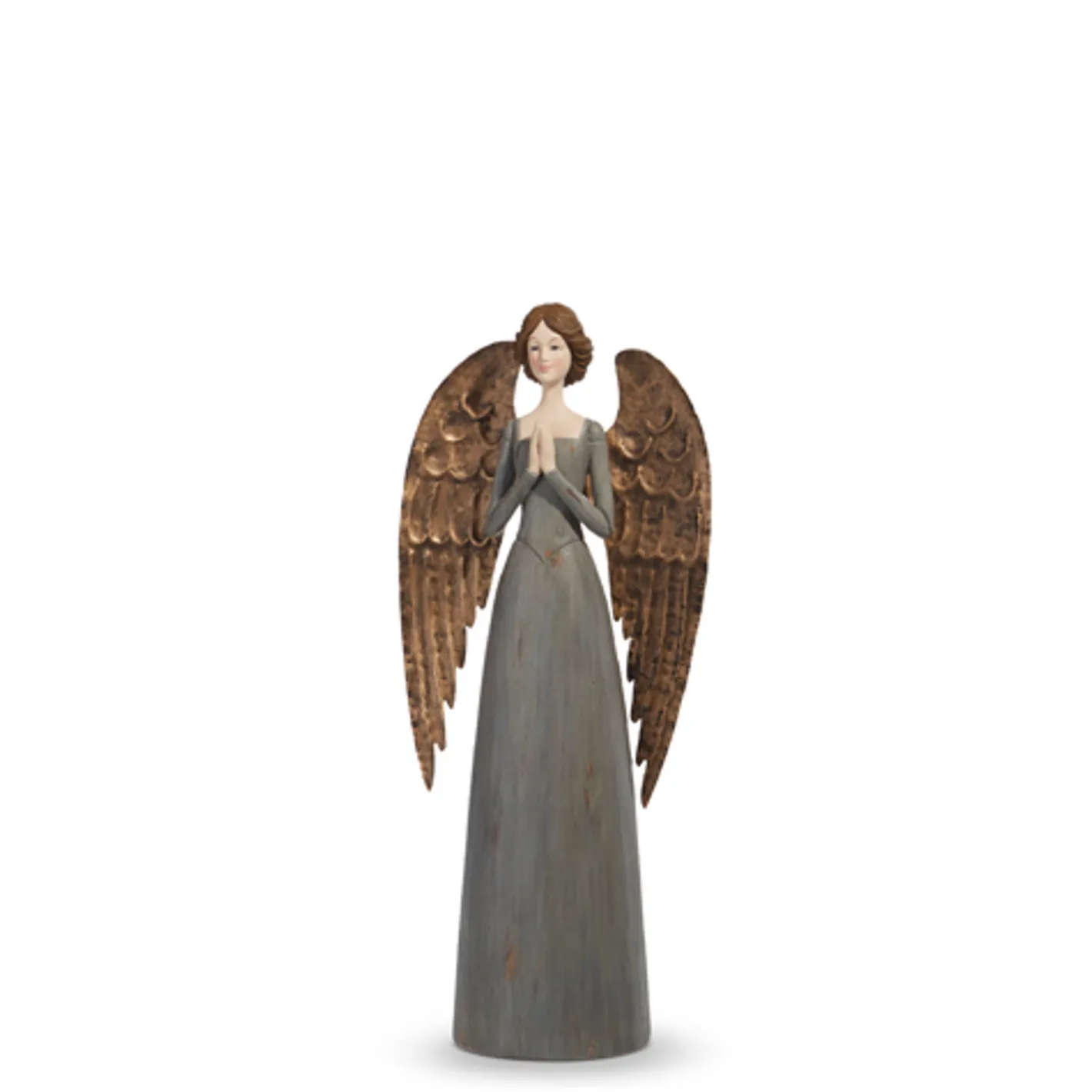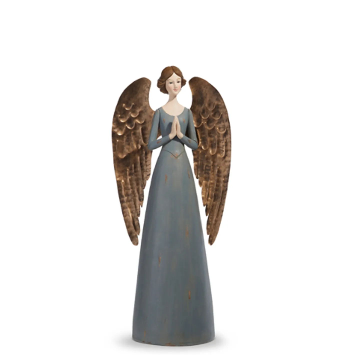 These gorgeous Santos angels hold their hands in a praying position, wear a pretty blue dress with and antique weathered look, short brown hair, and copper wings! Each sold individually. Made by Raz Imports. Made of resin and iron.