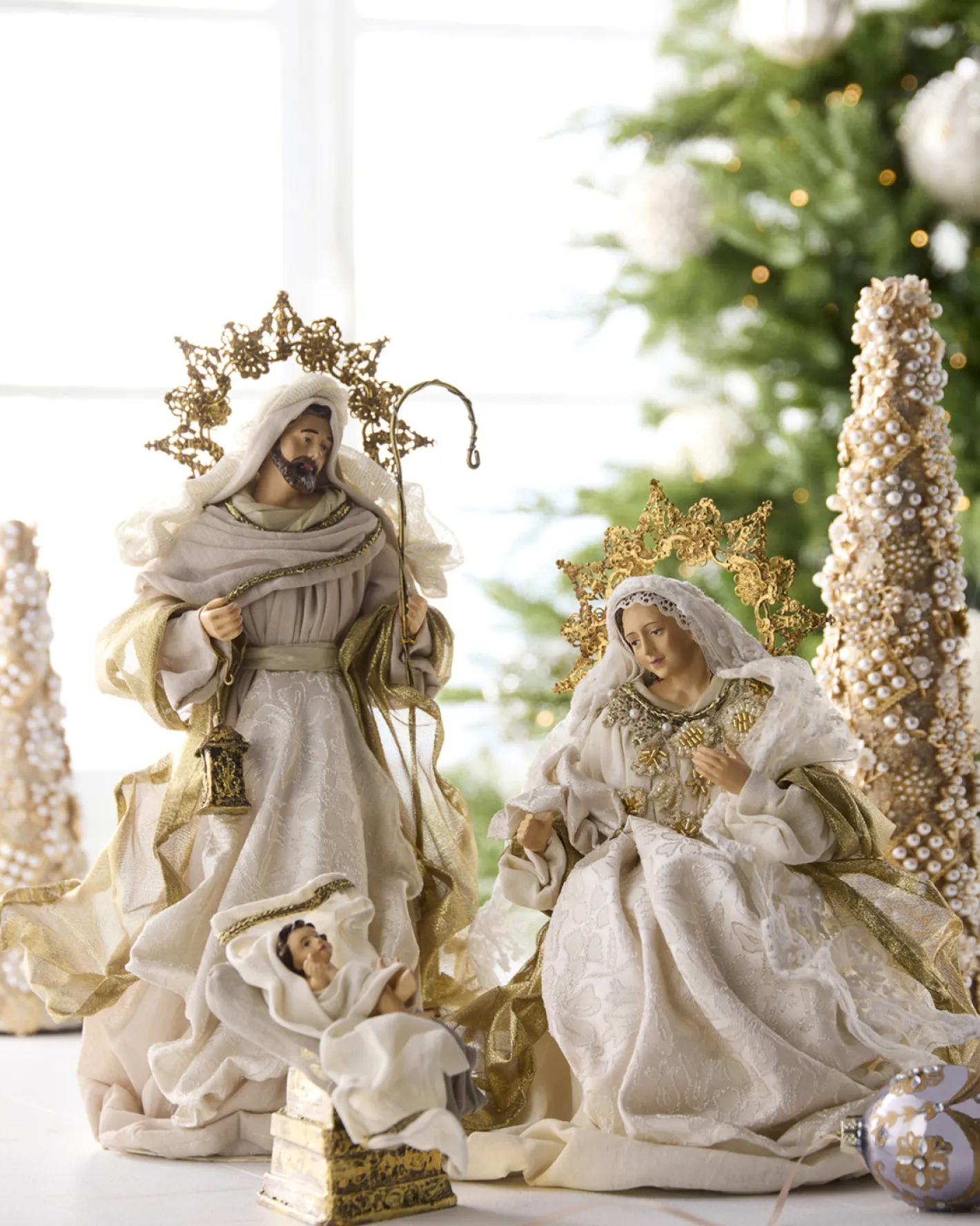 Celebrate the true meaning of the season with this elegant 16.5″ Holy Family decoration from Raz Imports. Clad in flowing robes of ivory, white, and shimmering gold, Mary, Joseph, and baby Jesus are beautifully sculpted with ornate gold detailing and radiant halos that frame Mary and Joseph in reverence. Perfect for mantel displays, tabletops, or entryway vignettes, this sacred trio brings a peaceful and graceful presence to your Christmas decor. A timeless piece for traditional, gold-themed, or faith-centered holiday homes. Sold as a set of 3. Made by Raz Imports. Made of Cotton, Polyester, Resin, Paper and Iron. Dimensions: 11″L X 8.5″W X 12.5″H; 8.5″L X 7″W X 16.5″H; 4″L X 5.5″W X 4.75″H. Item #: 4510651