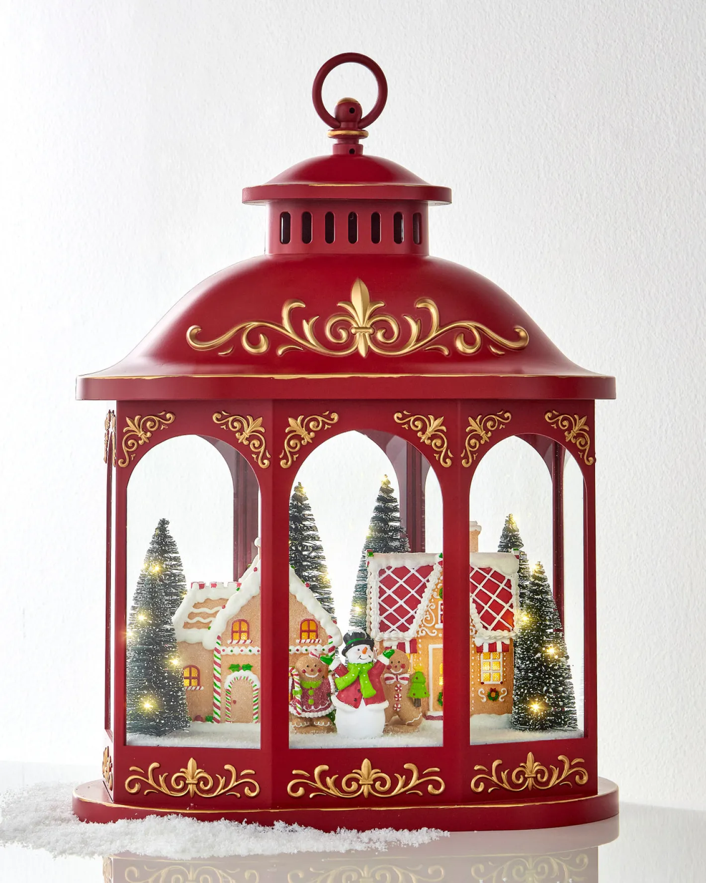 This stunning deep red lantern features large glass panels trimmed in gold designs! Inside of the lantern is a snow covered gingerbread village with lighted bottle brush trees and small Christmas characters smiling and waving! Requires 3 AA Batteries (not included), 6 Hour Timer Repeats Every 18 Hours. Includes Type C USB Cord. Made by Raz Imports. Made of plastic, resin, and glass. Dimensions: 13.25″ L X 7.25″ W X 17.25″ H.