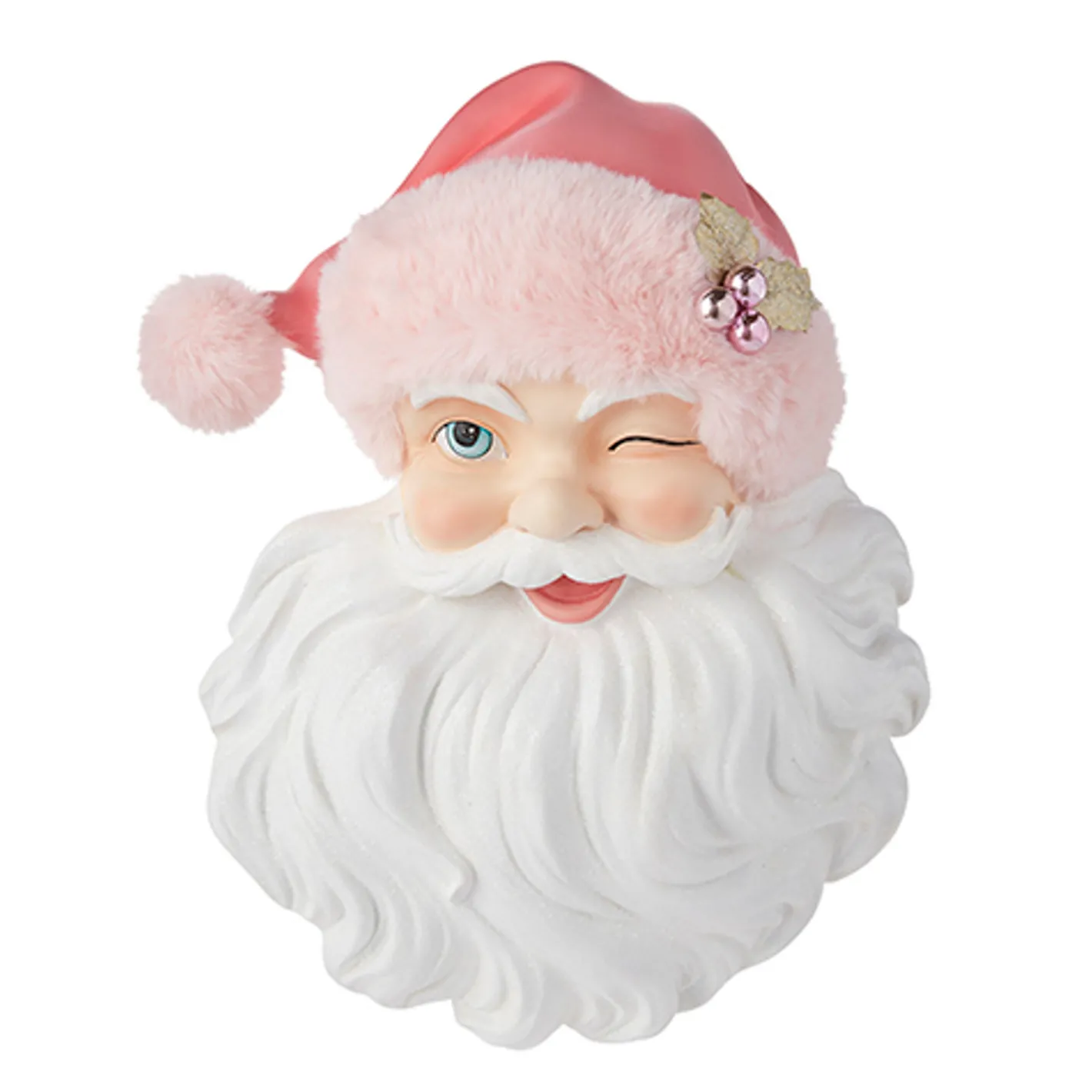 This pretty pastel Santa is sure to look amazing up on your wall this Christmas! It features a winking Santa face with bright blue eyes and blushing cheeks and a wide smile! He wears a pink hat trimmed in light pink fur and adorned with metallic pink berries and a glittered wreath! Made by Raz Imports. Made of resin. Dimensions: 17″ tall. Item #: 4210233