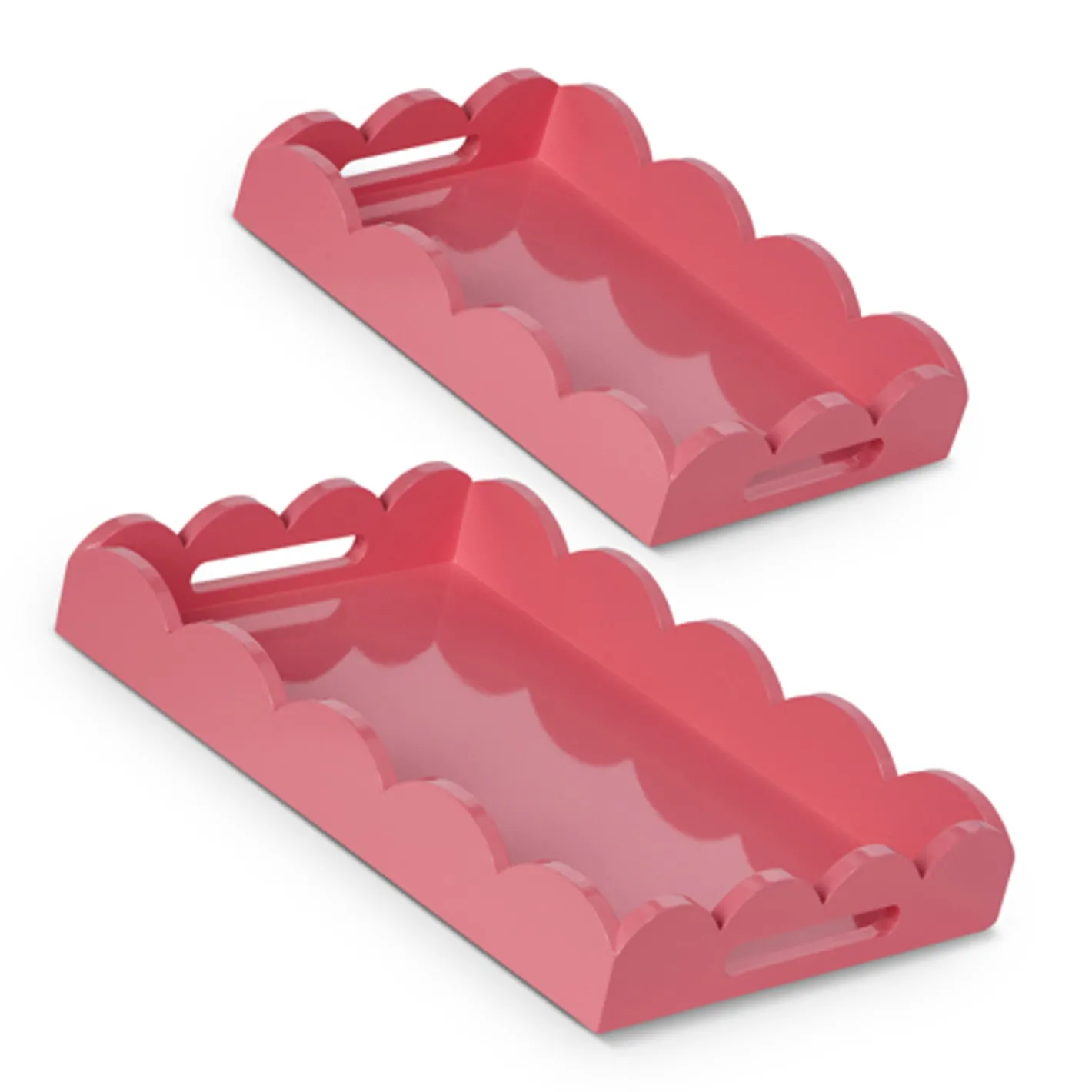 Add a pop of playful charm to your Easter celebrations with this set of two Bubblegum Pink Scalloped Trays! Featuring a bubble gum pink hue and elegant scalloped edges, these trays are perfect for serving treats, displaying festive décor, or creating a stunning holiday centerpiece. Whether you use them for cookies, candles, or Easter eggs, these versatile trays bring a touch of whimsy and sophistication to your springtime gatherings! Sold as a set of 2. Made by Raz Imports. Made of MDF. Dimensions: 18.5″L X 12.25″W X 2.75″H; 13.75″L X 10″W X 2.5″H.