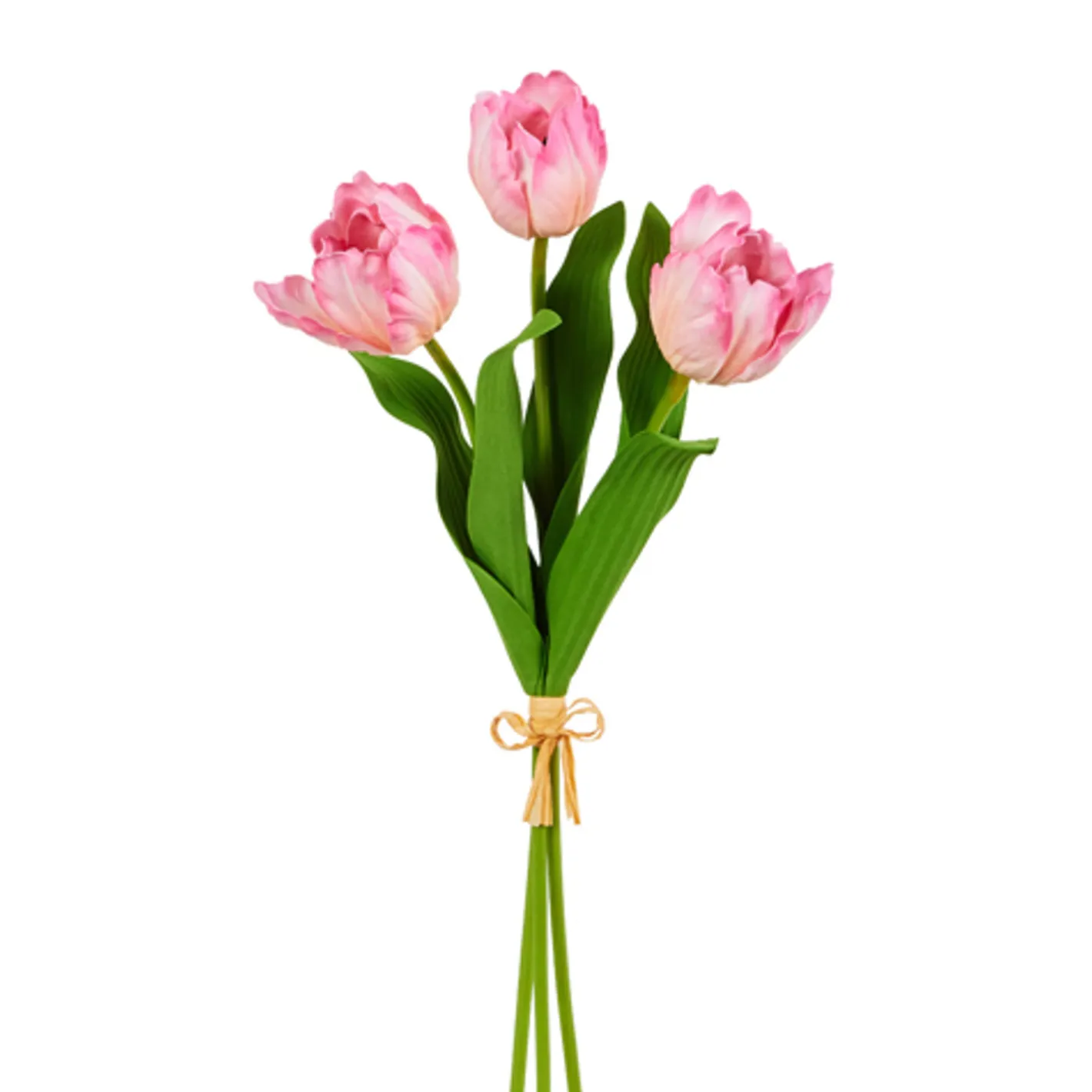 Add a touch of spring charm with these gorgeous pink tulips! Featuring real touch ruffled petals for a lifelike feel, this bundle of three stunning blooms is perfect for effortlessly elevating your décor. Display them in a vase for a fresh floral look or lay them on a coffee table tray for a delicate, decorative touch. A timeless spring favorite! Made by Raz Imports. Made of plastic and polyester. Dimensions: 18″.