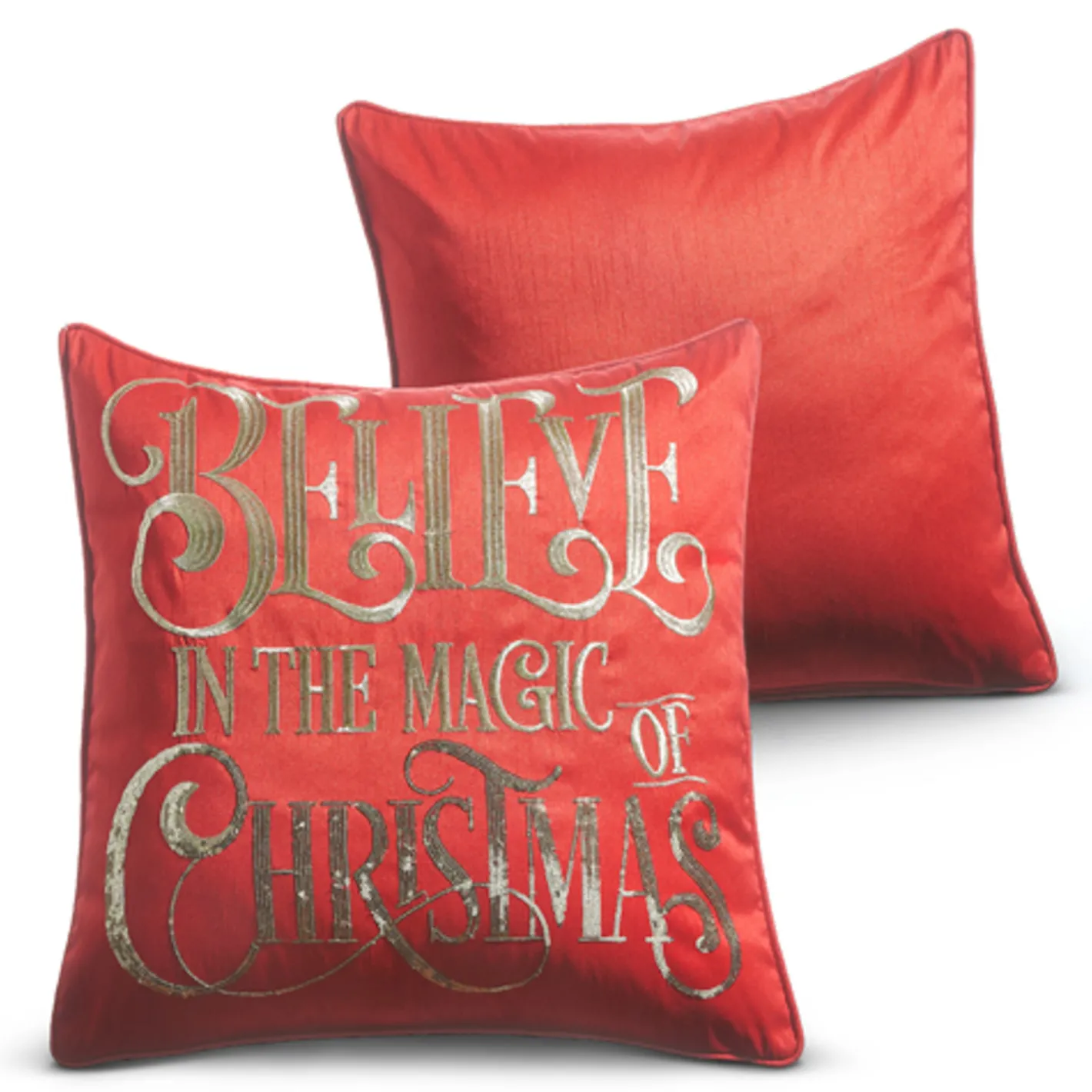Do you believe??! If ya do, you need this adorable dark red pillow with stunning gold embroidery lettering that reads “Believe In The Magic Of Christmas” and “Christmas” is covered in gold sequins! Made by Raz Imports. Made of cotton and polyester. Dimensions: 18″ square.