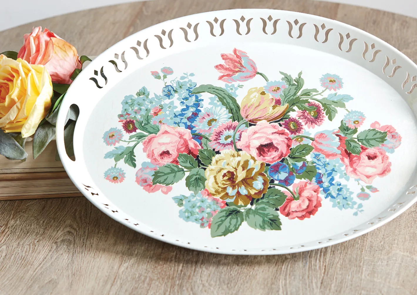 Decorate your coffee table with this stunning vintage inspired tray! It features a lovely white color with a tulip pattern punched in the edge and the center is decorated with an image of gorgeous vintage inspired flowers! Made by Raz Imports. Made of iron. Dimensions: 20.5″ long. Item #: 4257267