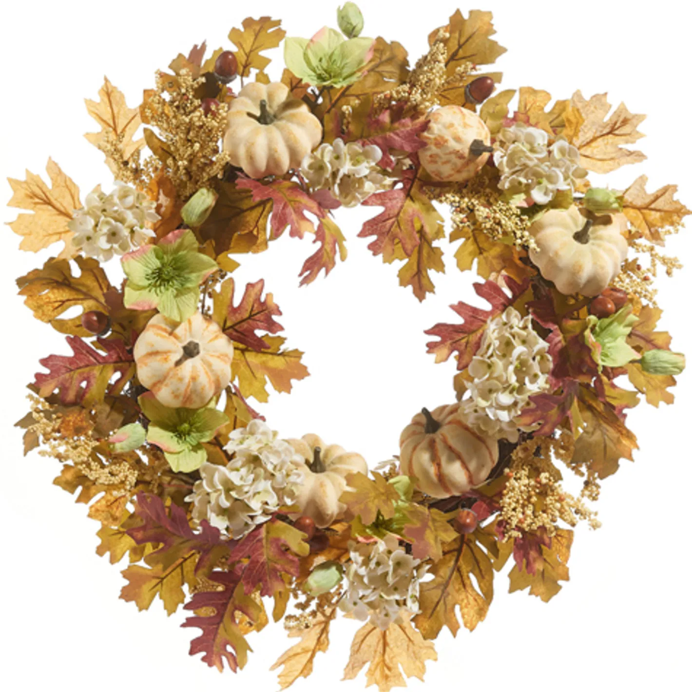 We love bringing in the fall vibes when the weather starts to get a little chilly! This wreath features colorful fall leaves, bundles of blooms, white berries, and tiny white pumpkins! Made by Raz Imports. Made of polyester and plastic. Dimensions: 24″. Item #: W4302318