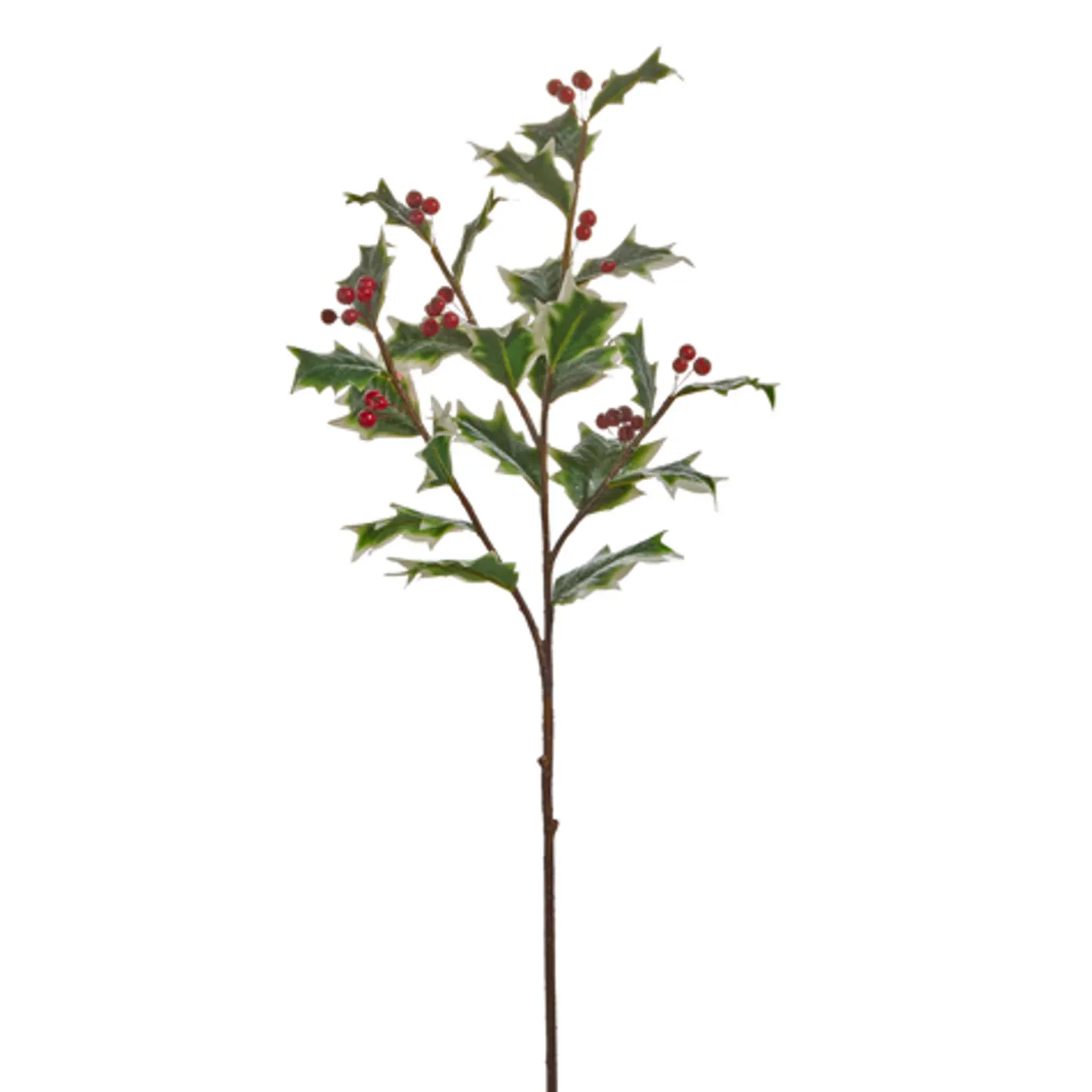 A stunning variegated holly leaf bundle dotted with bright red berries and a light dusting of glitter, this pick is sure to liven up your Christmas tree this holiday season! Made by Raz Imports. Made of polyester. Dimensions: 31″.