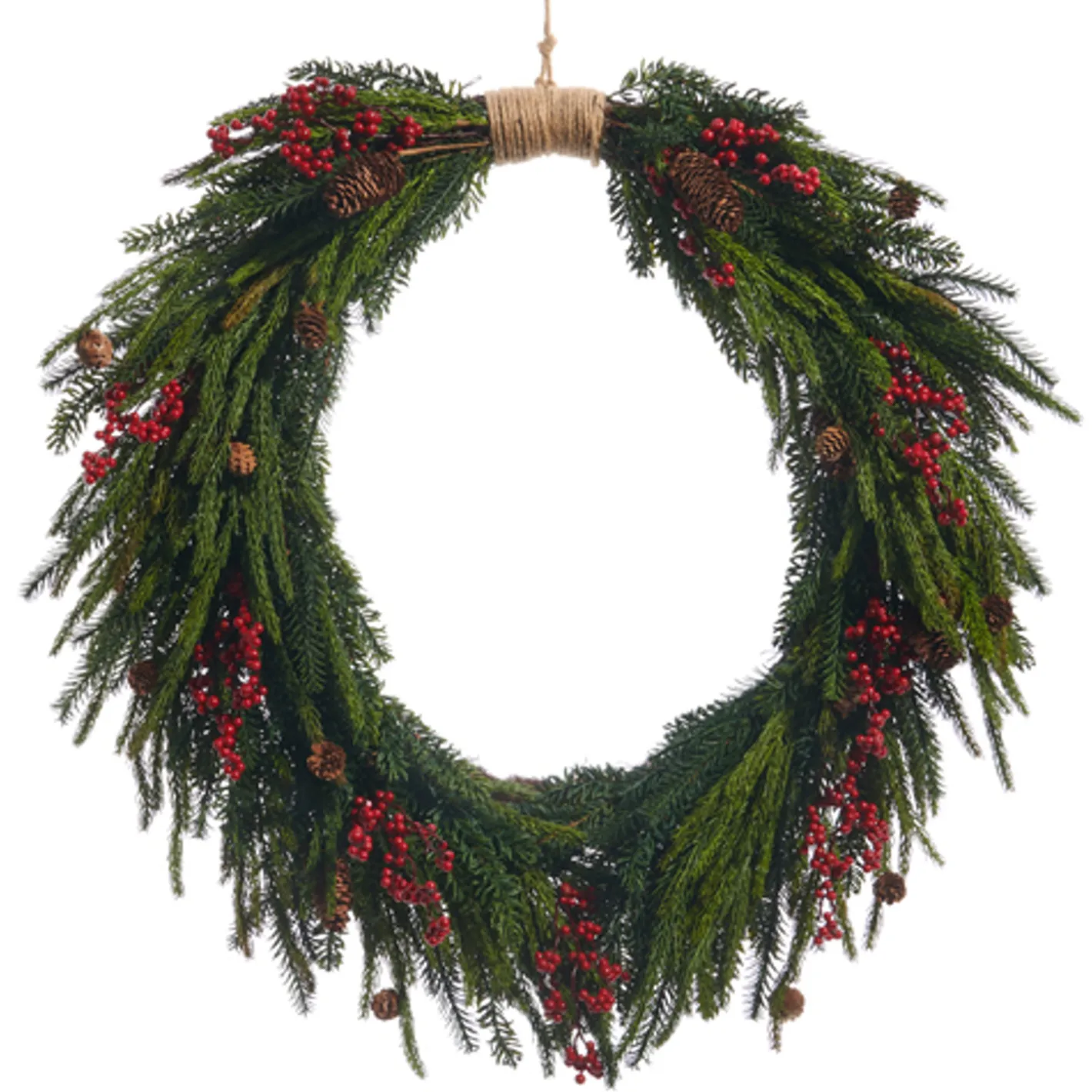 Thin and spindly pine branches in a gorgeous green color dotted with small pinecones and bright red berries! Made by Raz Imports. Made of Plastic, Wood, Polyester, Pinecone, Foam and Jute. Dimensions: 32″ L X 33″ H.