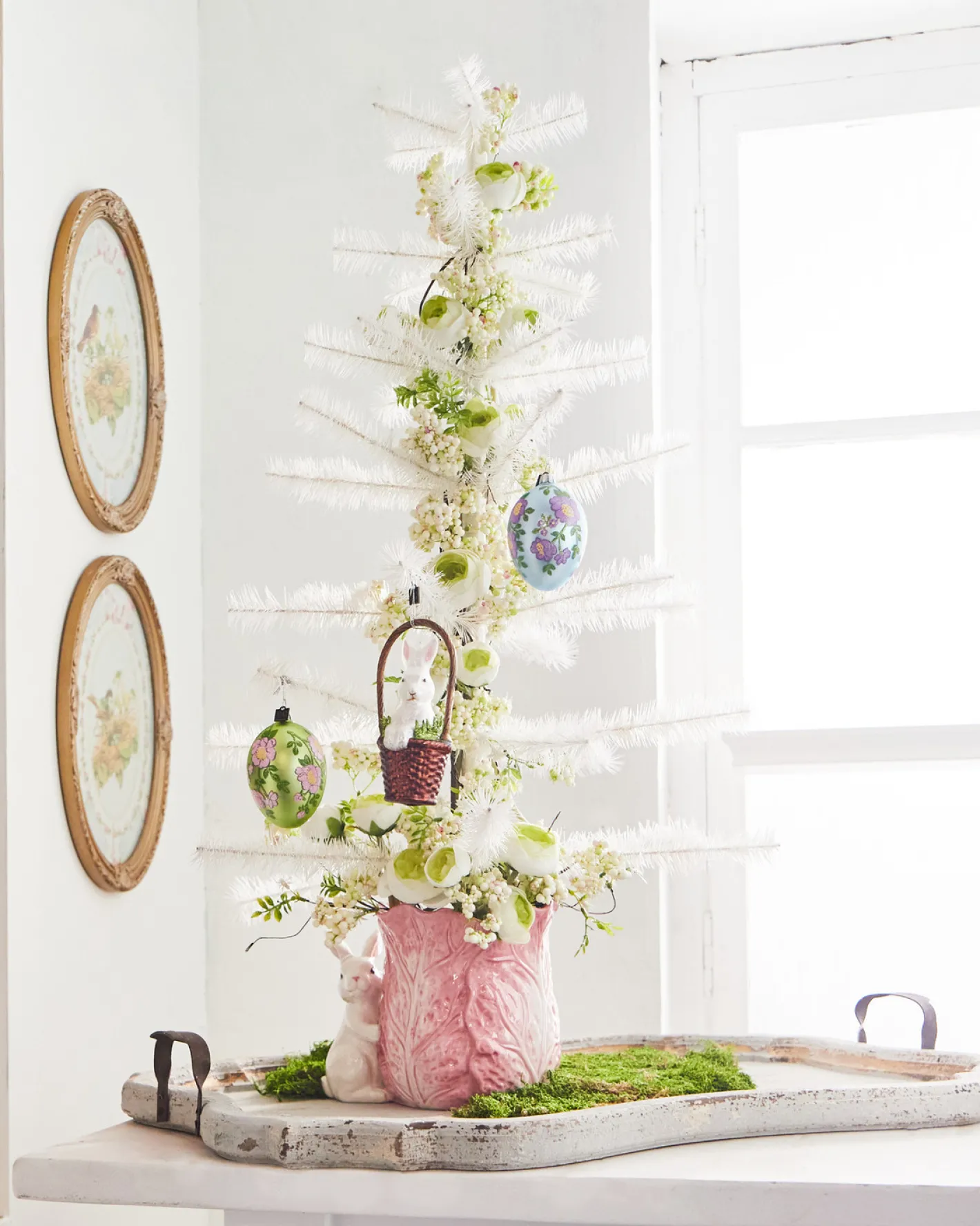 Who says decorating trees is just for Christmas?! Not us! This stunning tree is made of tiny, thin white feathers and is perfect to hang your Easter ornaments or special vintage garlands on! Use this for Easter, Valentines day, Christmas or any other holidays that you love! Made by Raz Imports. Made of feathers and wood. Dimensions: 21″ D X 36″ H.