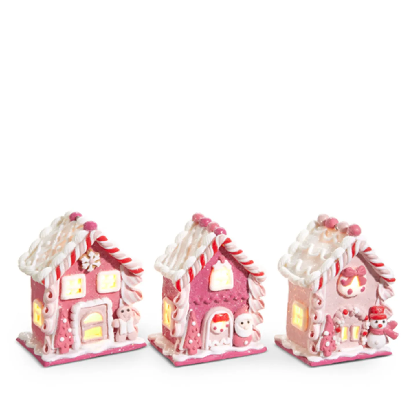Each gingerbread house is a stunning shade of pink decorated with pink and white striped ribbon candy, pink peppermint sticks, and a pile of white icing on the roof! Small Christmas characters stand out front to welcome all guests as a warm light leaks through the windows! These ornaments would be perfect for your gingerbread or pink themed tree. Each sold individually. Requires 3 Lr44 Batteries. 6 Hour Timer Repeats Every 18 Hours. Made by Raz Imports. Made of clay dough. Dimensions: 3.25″L X 2.5″W X 4.25″H.Â