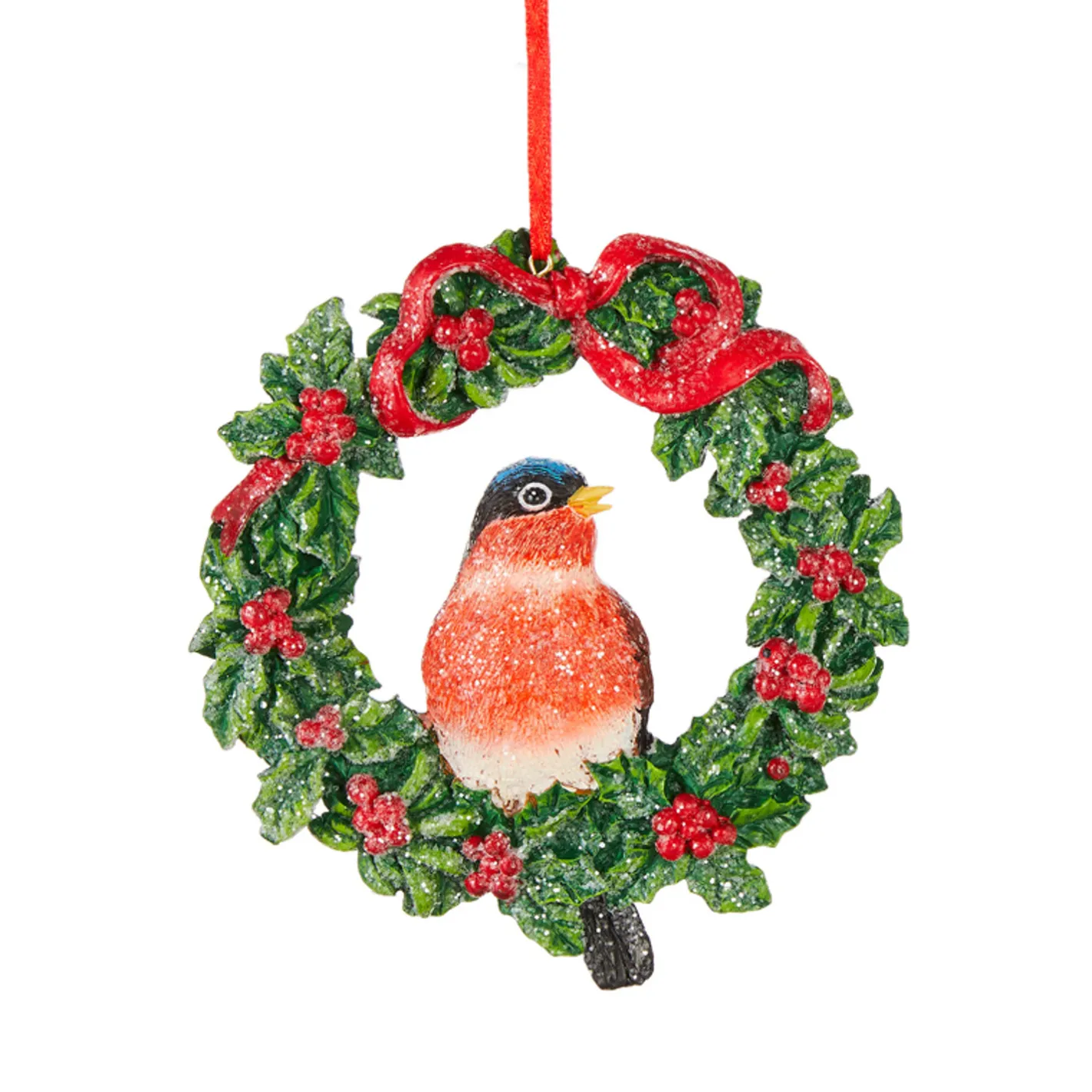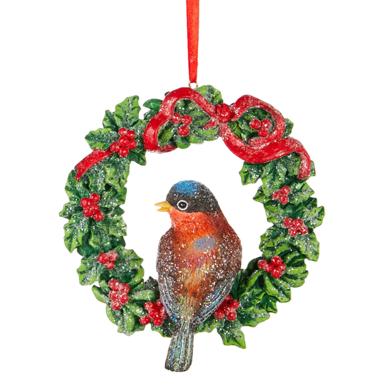 These cute little birdies are ready for the holidays! These ornaments feature a holly wreath with little red berry bundles and a red ribbon tied into a lovely bow! In the center of each wreath a small bird is perched, each bird has beautiful red brown, and blue coloring with bright yellow beaks! Each sold individually. Made by Raz Imports. Made of resin. Dimensions: 4.5″ h. Item #: 4107015
